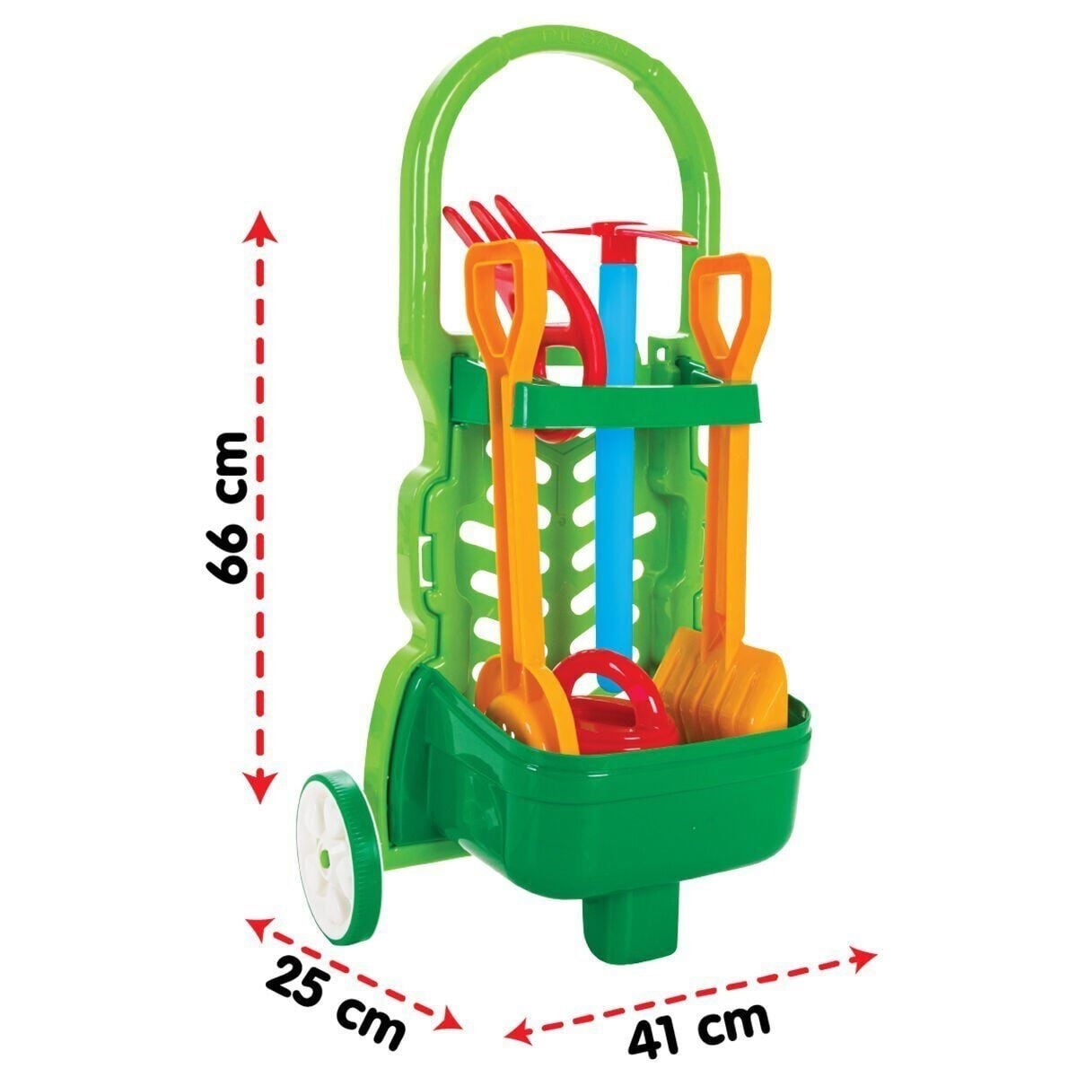 • Üründe 1 taşıma arabası, 1 kürek, 1 tırmık, 1 kazma, 1 el kazıyıcısı ve 1 adet bahçe sulama ibriği olmak üzere toplam 6 parçadan oluşur.