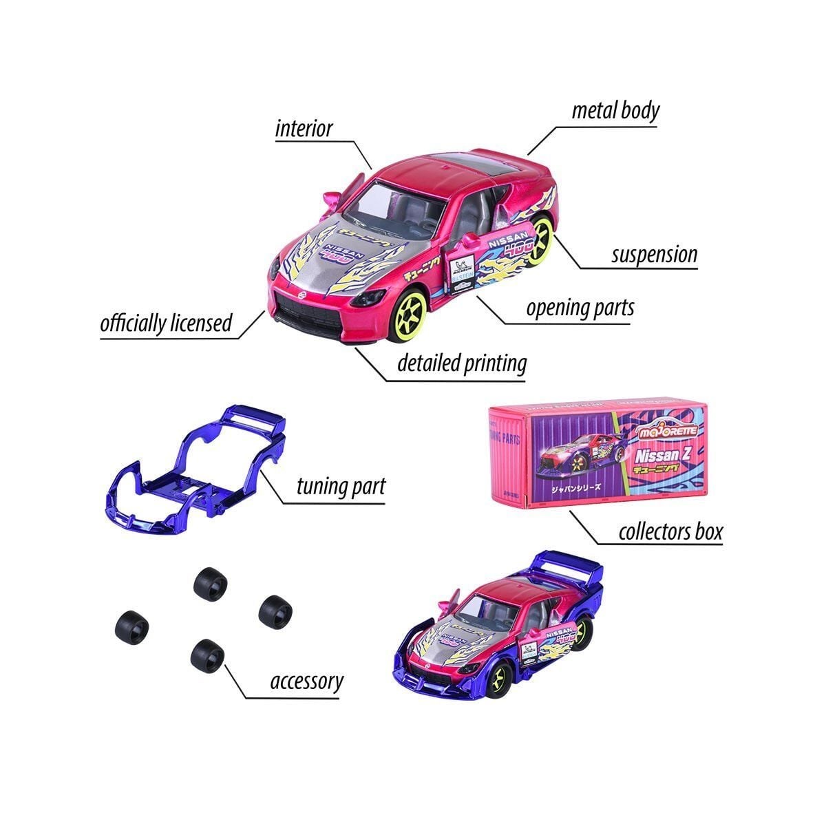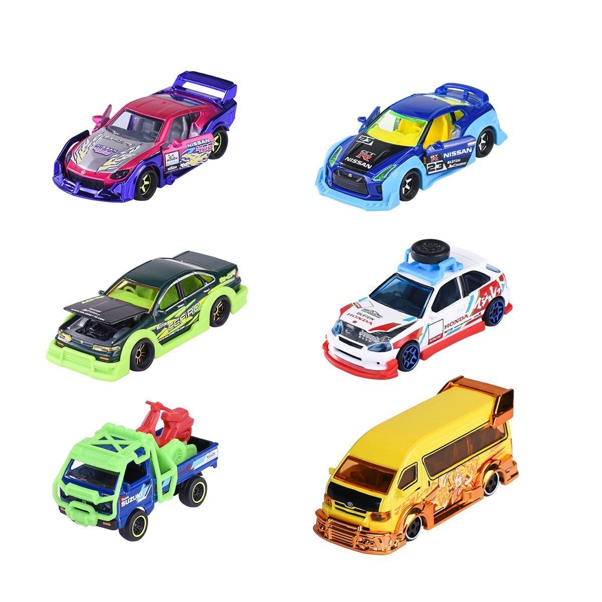 Abartılı tasarımlar ve parlak renkler: Bu model araçlar Japon pop kültürüne bir övgüdür! Her araç çok renkli bir tasarıma sahiptir ve havalı bir aksesuar ve çıkarılabilir ayar parçası ile birlikte gelir – çocuklar ve koleksiyoncular için olmazsa olmazdır!