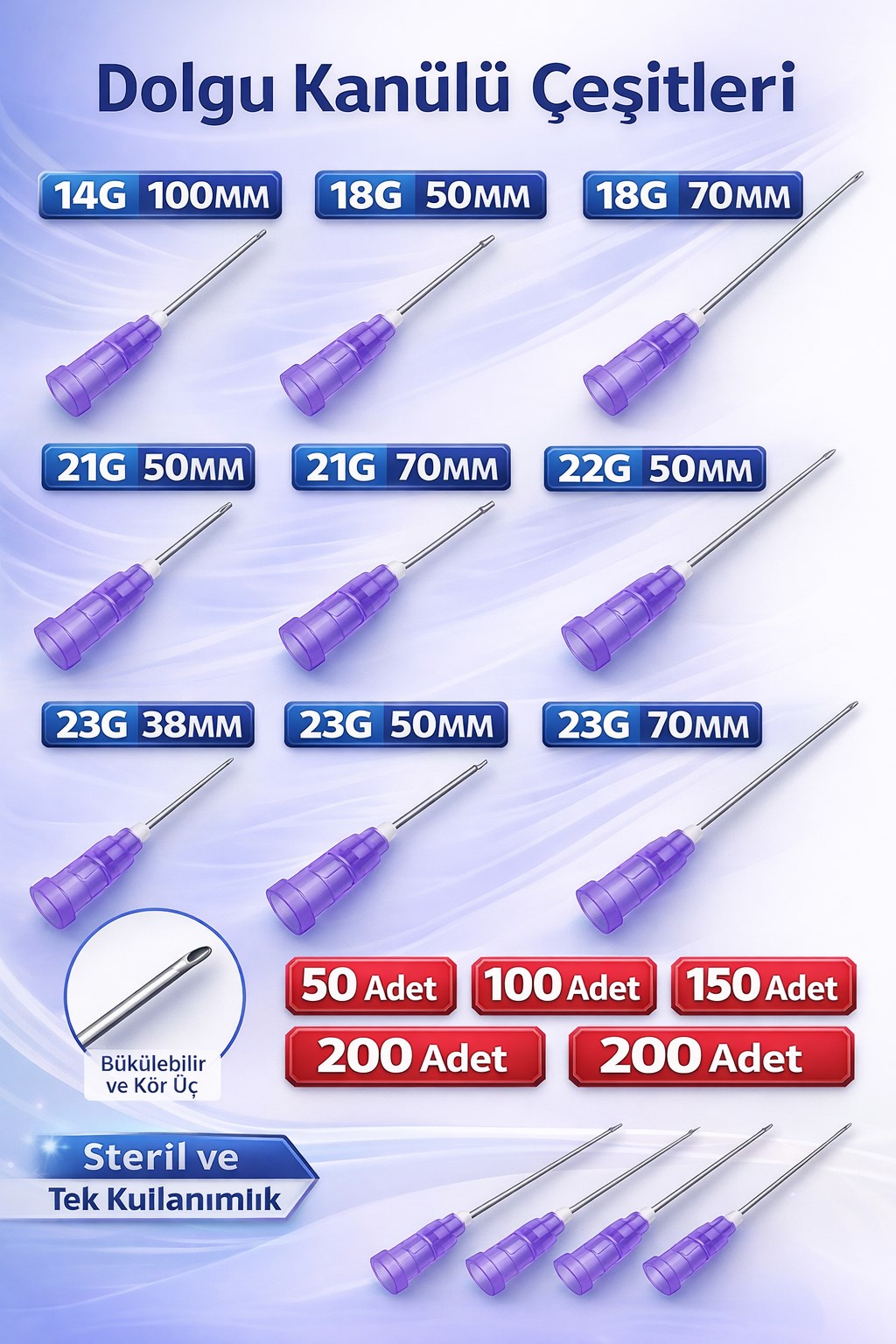 22G 70MM dolgu kanülü, estetik işlemlerde hassas dolgu uygulamaları için uygundur. İnce ve dayanıklı yapısıyla profesyonel kullanım sağlar.