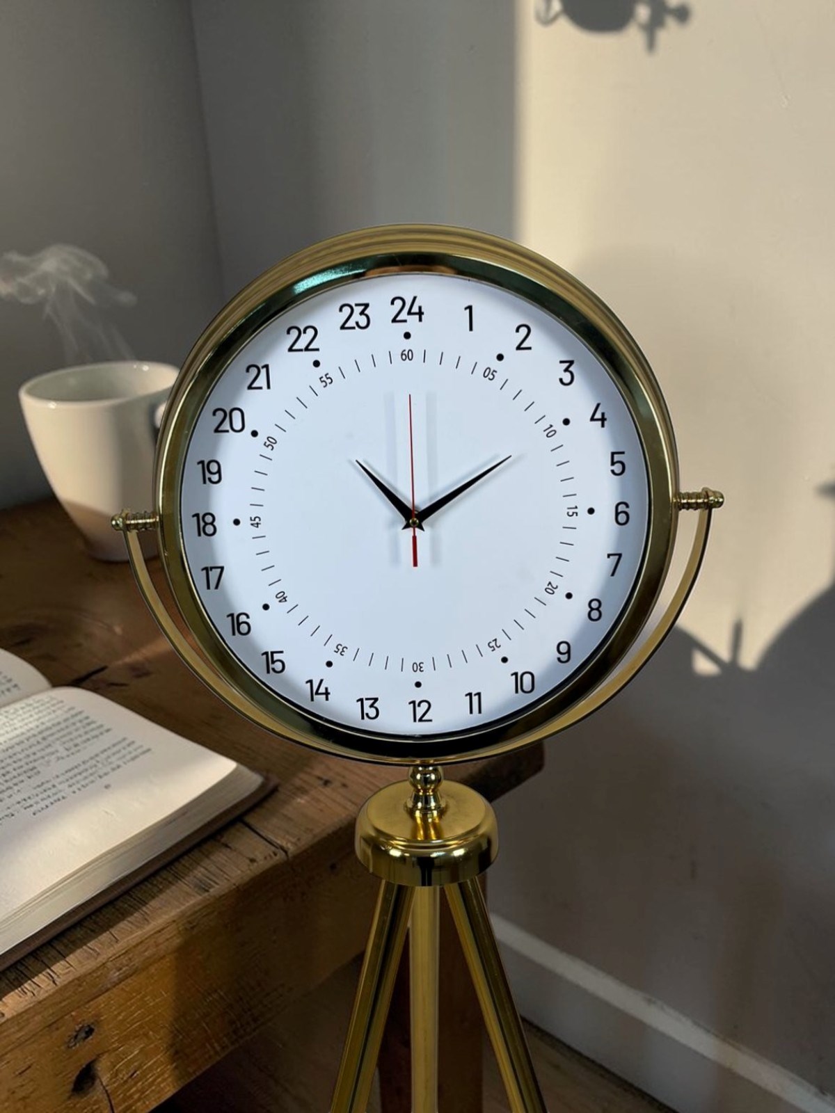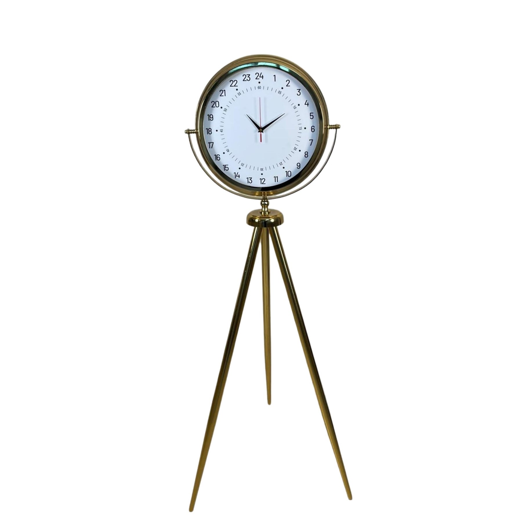 Şık ve dikkat çekici tasarımıyla öne çıkan Gold Tripod Ayaklı 24 Saat Göstergeli Dekoratif Saat, klasik saat modellerinden farklı olarak 24 saatlik zaman formatını gösteren özel kadran tasarımına sahiptir. Bu özelliği sayesinde hem dekoratif hem de fonksiyonel bir kullanım sunan saat, yaşam alanlarında farklı ve dikkat çekici bir atmosfer oluşturur.
