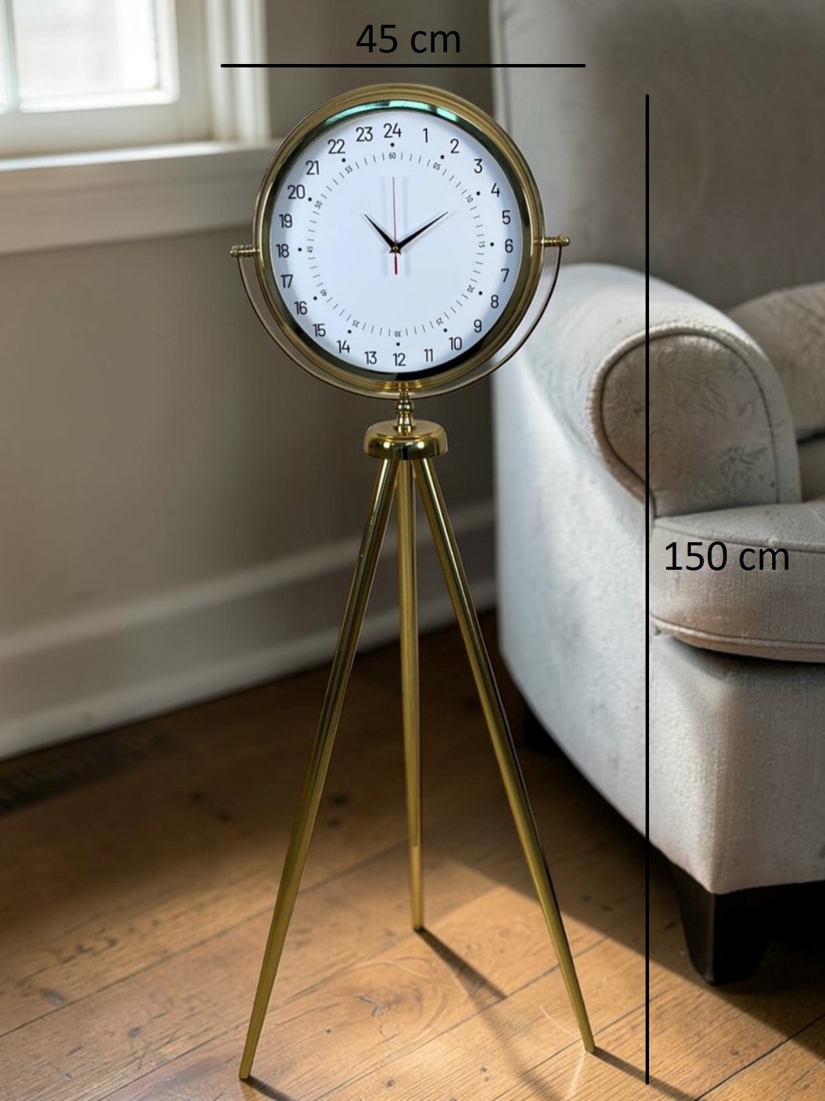 Modern tripod ayak yapısı ve zarif gold metal gövdesi sayesinde bu saat yalnızca bir zaman göstergesi değil aynı zamanda bulunduğu ortamın dekorasyonunu tamamlayan estetik bir tasarım objesidir. İnce ve dengeli metal tripod ayak yapısı saatin bulunduğu zeminde şık ve modern bir duruş sergilemesini sağlar. 150 cm yüksekliği sayesinde özellikle salon, ofis, otel lobisi, showroom ve geniş yaşam alanlarında güçlü bir dekoratif odak noktası haline gelir.