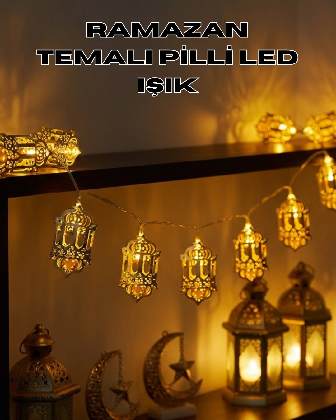 Pilli Ramazan Işıkları Altın Renk Fener Figürlü Led Süsleme