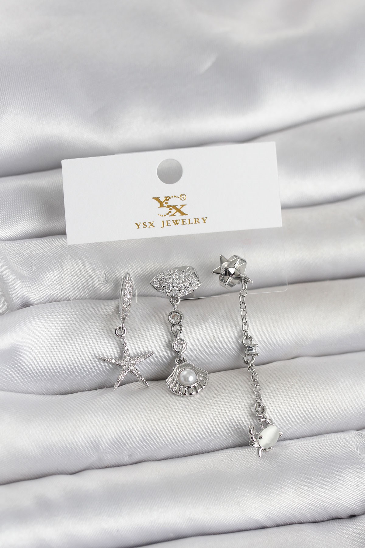 Pirinç Gümüş Renk Zirkon Taşlı Deniz Temalı 3'lü Kadın Küpe