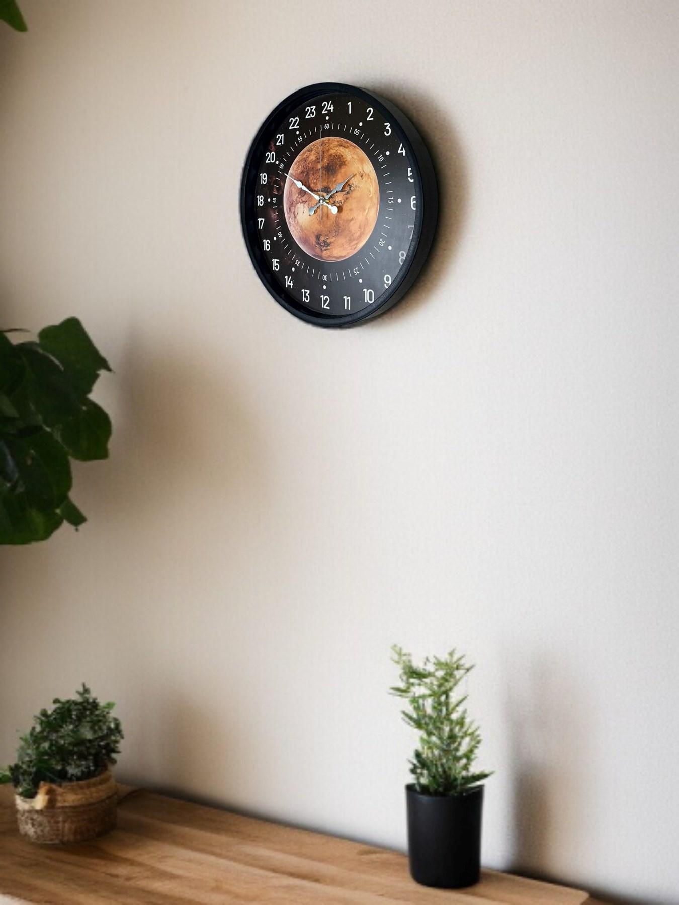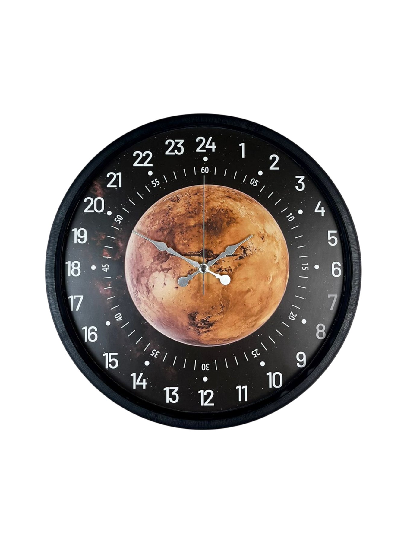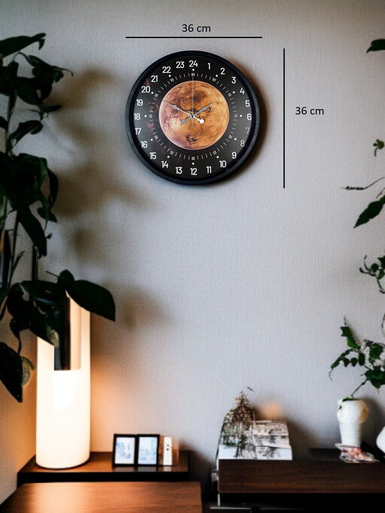 Standart duvar saatlerinden farklı olarak 24 saatlik zaman dilimine göre tasarlanan bu 36 cm siyah duvar saati, zamanı alışılmışın dışında bir bakış açısıyla sunar. Kadranın merkezinde yer alan gezegen (Mars) temalı özel görsel tasarım, saate dekoratif ve dikkat çekici bir karakter kazandırır.