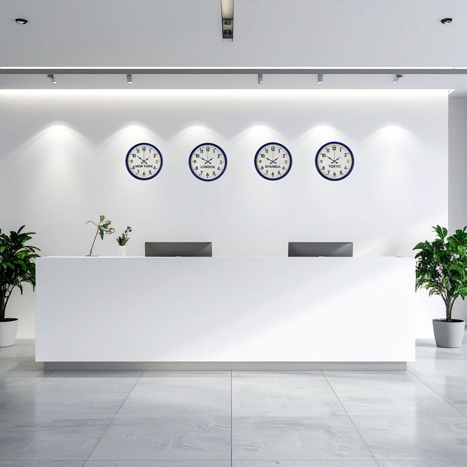 Şıklığı ve profesyonelliği bir araya getiren Platin Saat 36 cm 4’lü dünya saatleri seti, lacivert kasa tasarımı ile bulunduğu ortama güçlü ve prestijli bir görünüm kazandırır. New York, London, Istanbul ve Tokyo saatlerini aynı anda takip etmenizi sağlayan bu özel set; oteller, resepsiyon alanları, ofisler ve uluslararası çalışan işletmeler için ideal bir çözümdür.