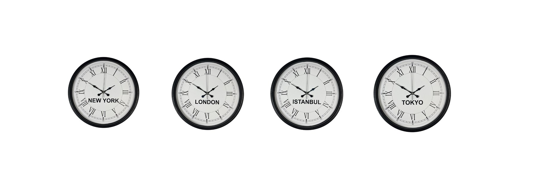 New York, London, Istanbul ve Tokyo saatlerini aynı anda takip etmenizi sağlayan bu özel set; oteller, resepsiyonlar, ofisler ve uluslararası çalışan işletmeler için hem fonksiyonel hem de dekoratif bir çözümdür.