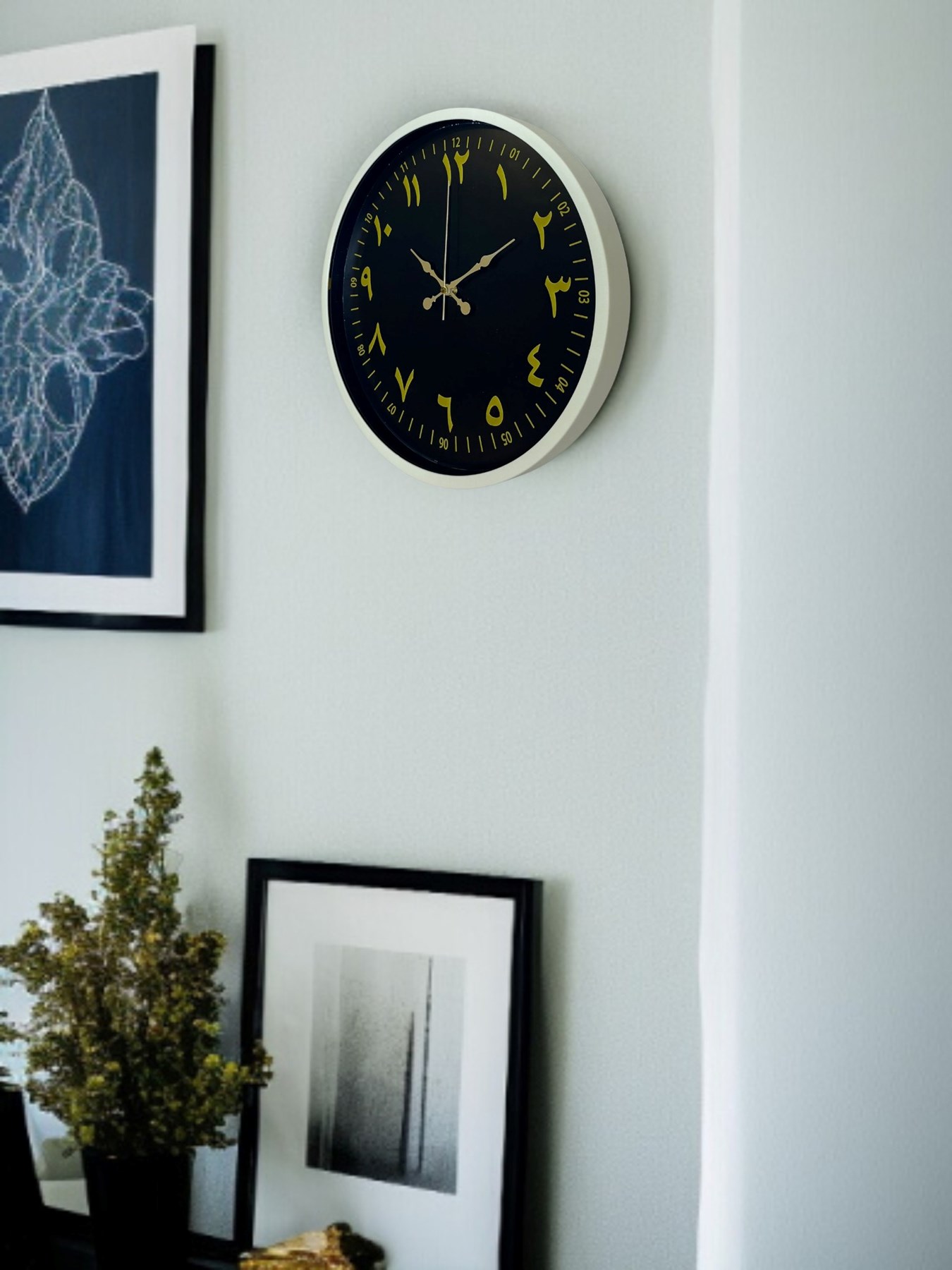 Arapça rakamlı kadranı ve siyah zemin üzerindeki gold tonlu detaylarıyla öne çıkan bu 36 cm krem duvar saati, klasik estetiği modern çizgilerle buluşturur. Farklı ve anlamlı tasarımı sayesinde standart duvar saatlerinden ayrılır; bulunduğu ortama karakter ve zarafet katar.