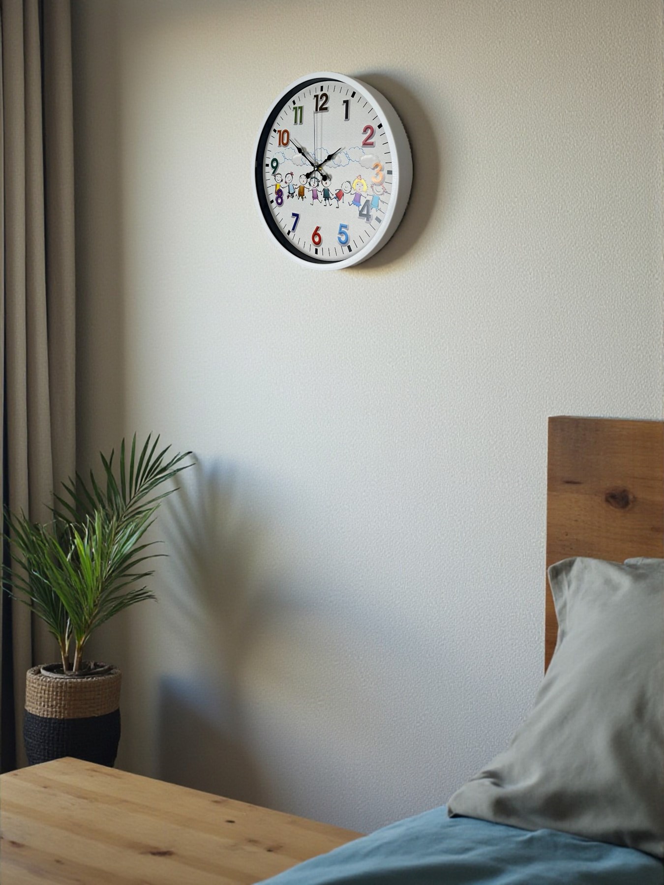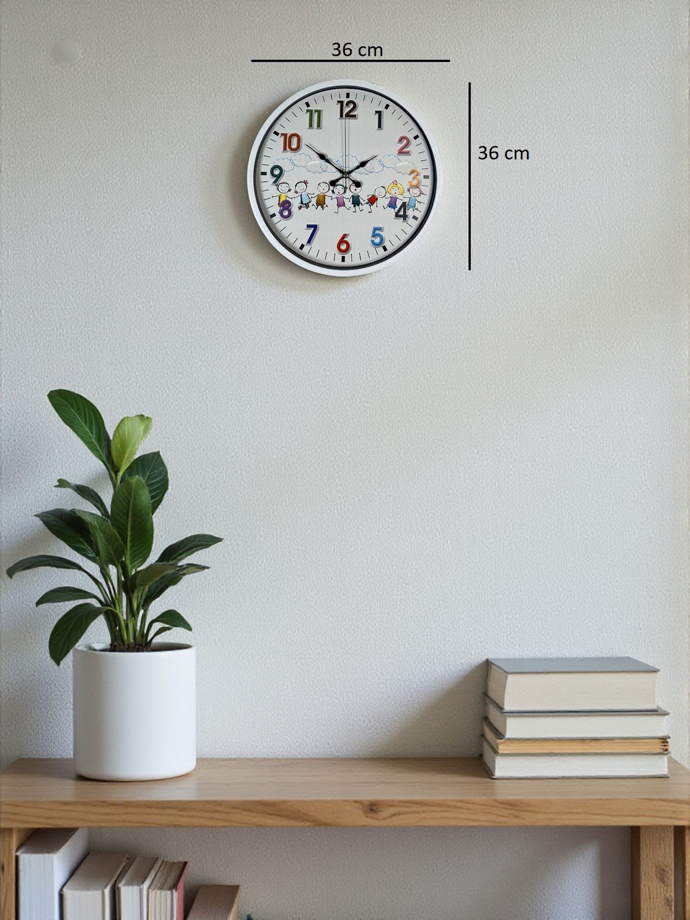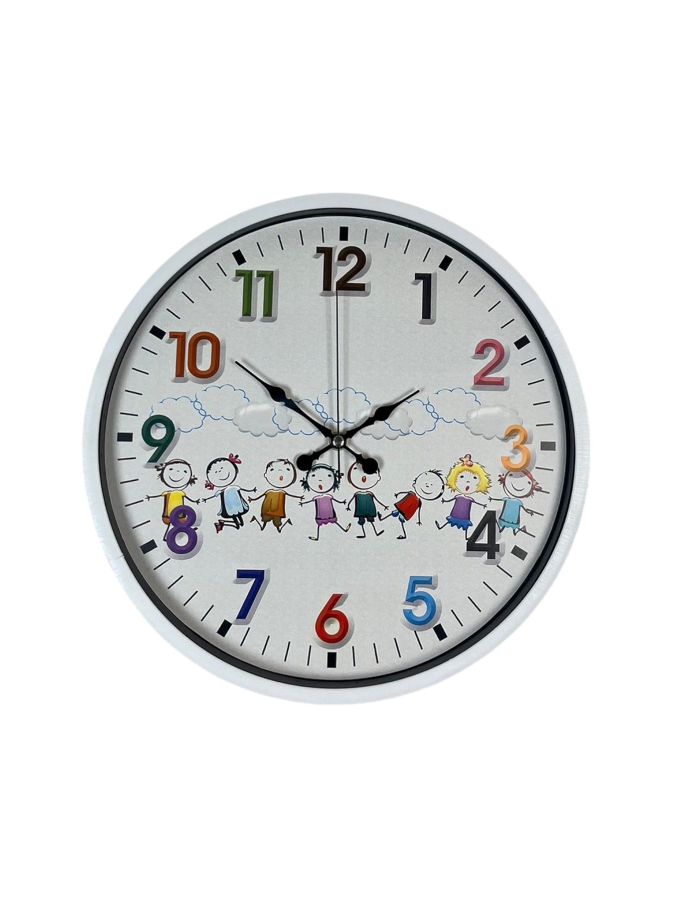 Renkli rakamları ve neşeli çocuk figürleriyle tasarlanan bu 36 cm çocuk odası duvar saati, miniklerin odasına hem eğlence hem de düzen katar.
