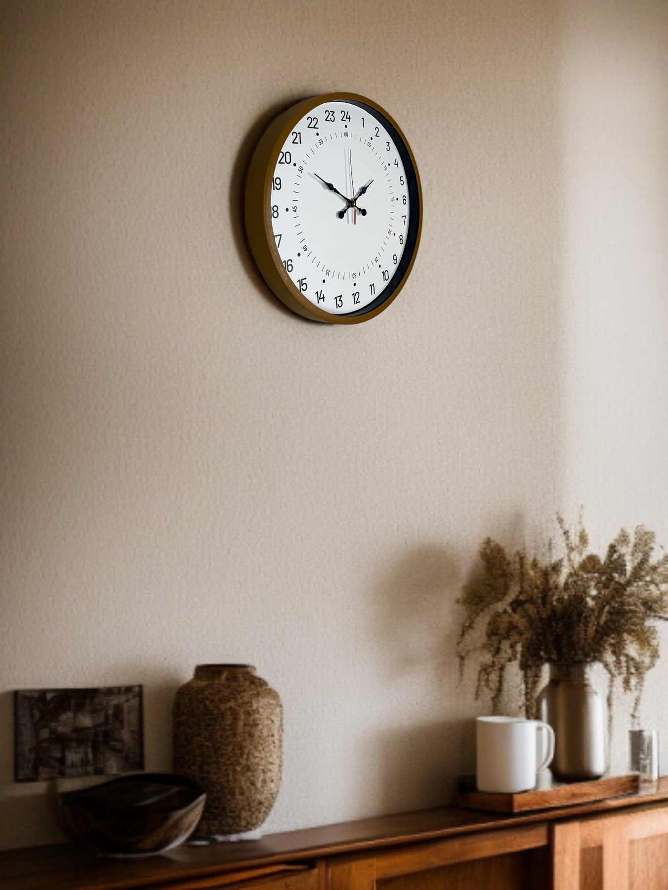 Bu özel tasarım duvar saati, klasik 12 saatlik saatlerden farklı olarak 24 saatlik zaman sistemine sahiptir. Kadran üzerinde yer alan 1–24 arası rakamlar sayesinde günün tamamı tek bir turda okunur. Bu özelliğiyle zamanı daha bilinçli ve net takip etmek isteyenler için sıra dışı ve fonksiyonel bir kullanım sunar.