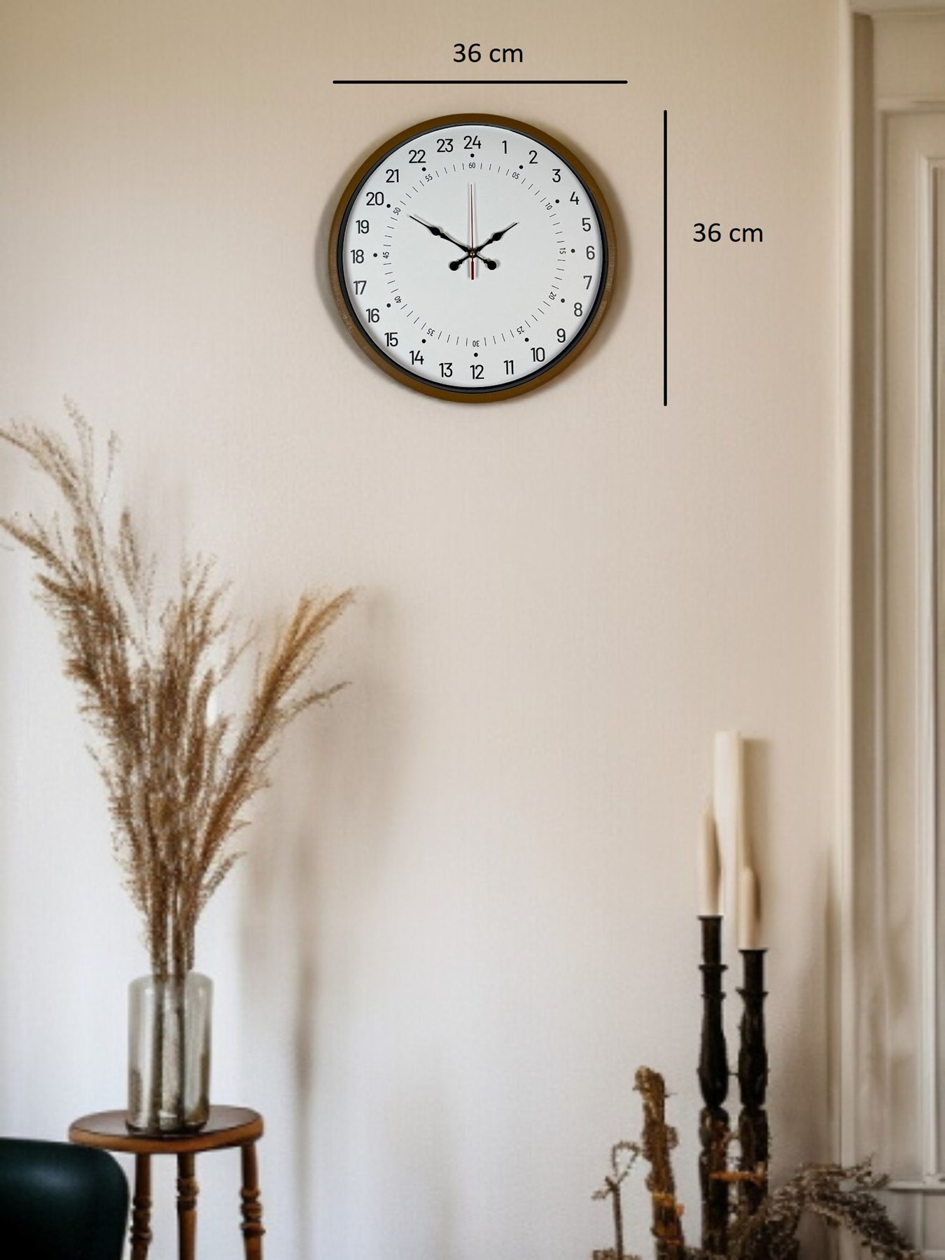 36 cm çapı ile duvarda dengeli ve dikkat çekici bir duruş sergileyen bu 24 saat göstergeli saat, klasik saat anlayışının dışına çıkan farklı ve özgün bir dekorasyon parçasıdır.