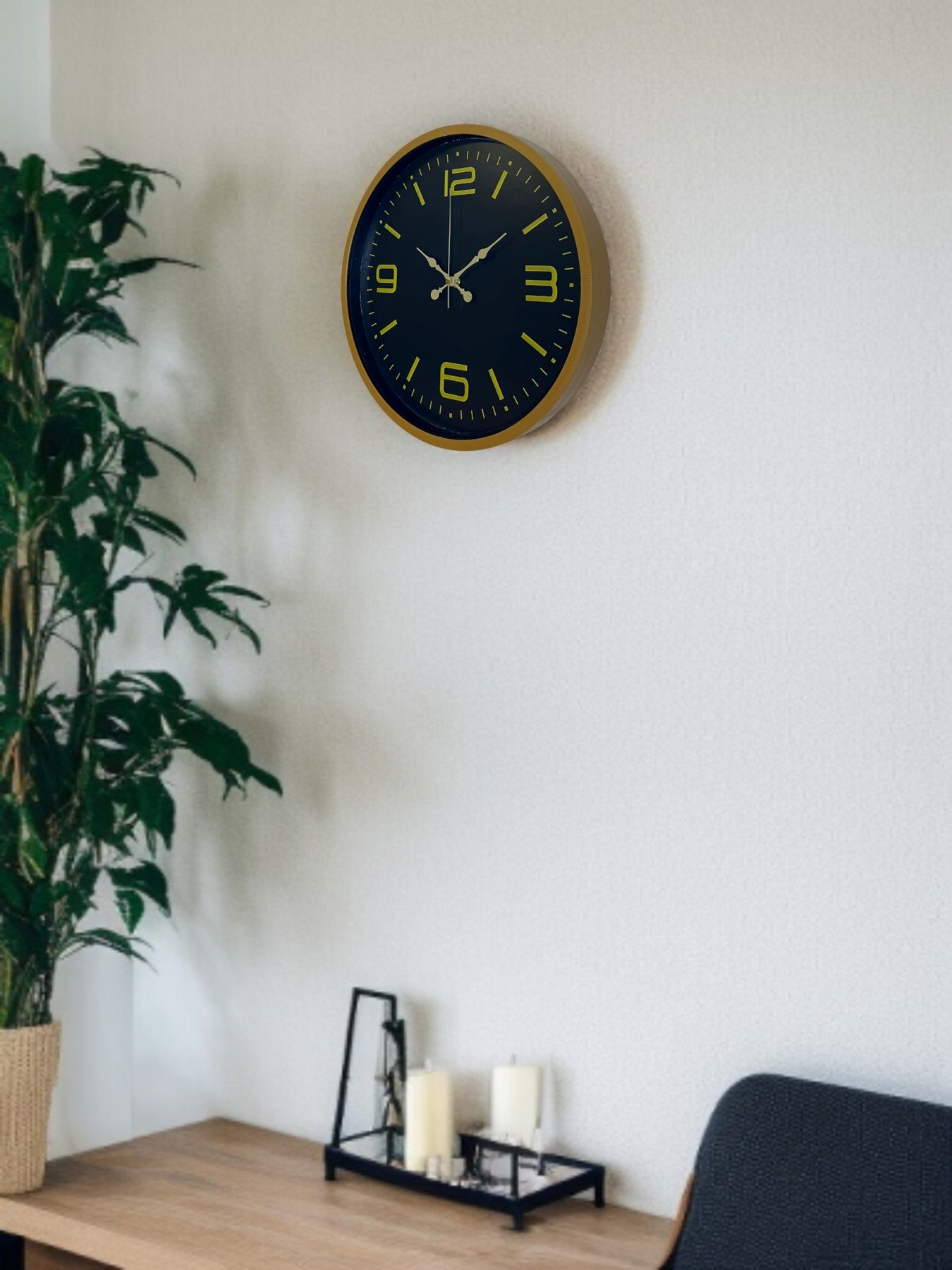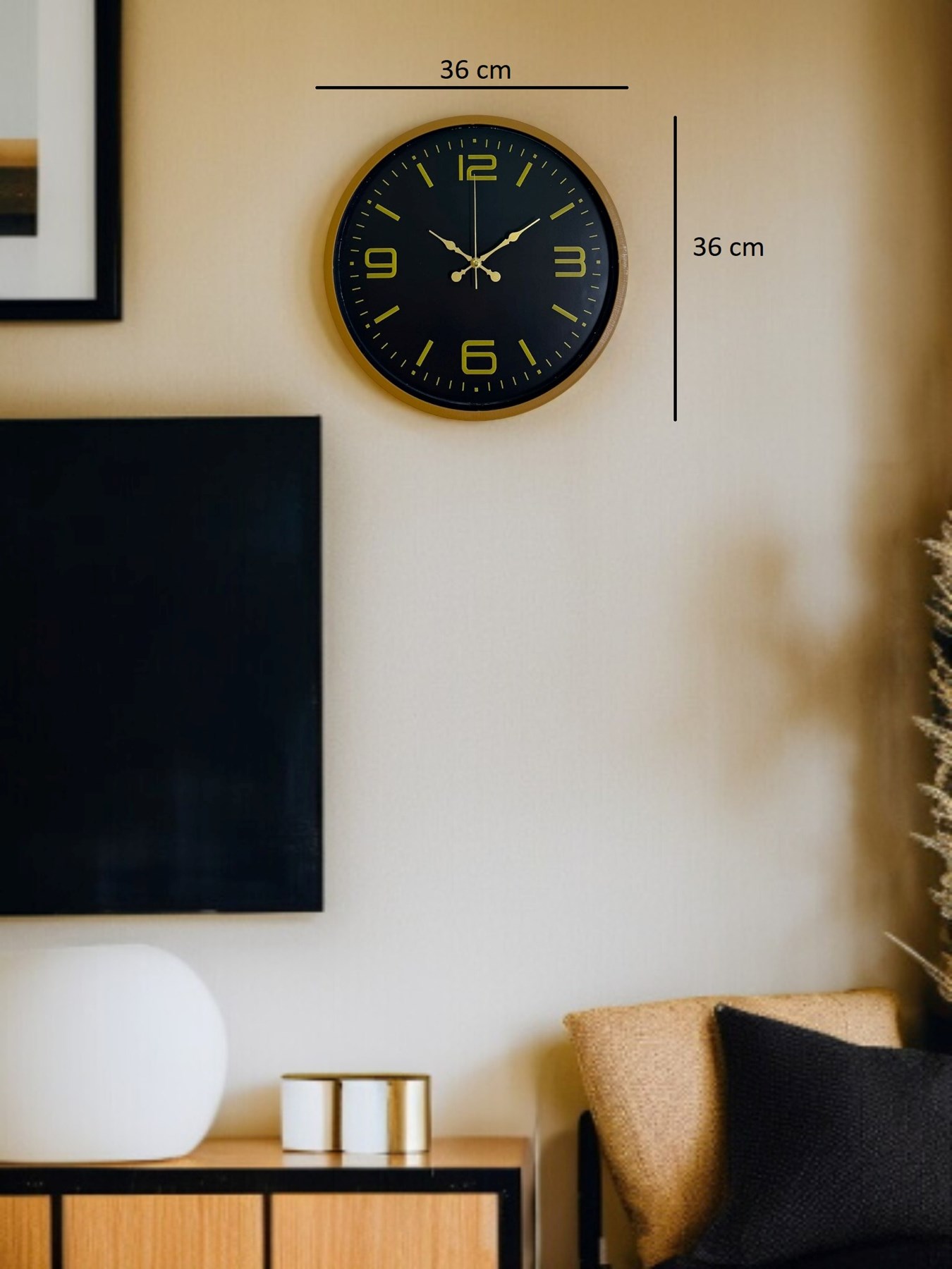 Kahverengi çerçevesi, siyah kadranı ve gold tonlu rakamlarıyla tasarlanan bu 36 cm duvar saati; bulunduğu ortama sıcak, şık ve zamansız bir hava katar. Büyük ve net rakamları sayesinde uzaktan dahi kolayca okunur, günlük kullanımda pratiklik sağlar.