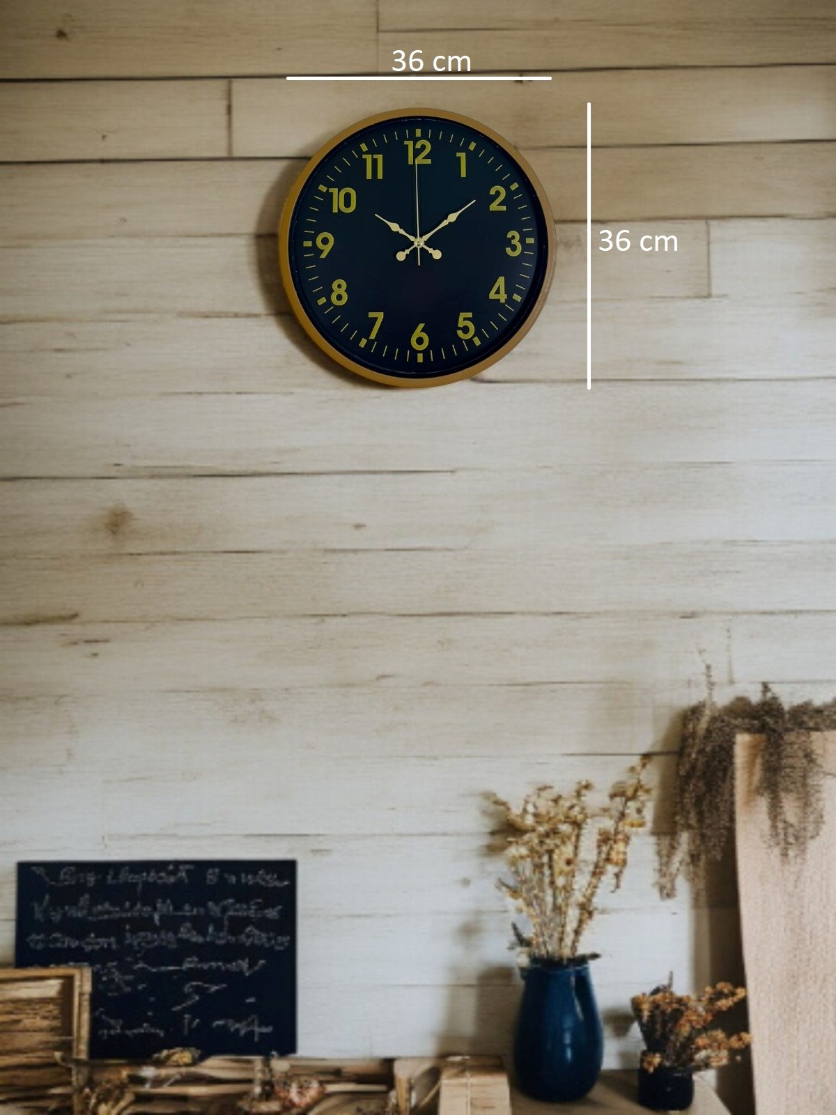 Kahverengi çerçevesi, siyah kadranı ve gold tonlu rakamlarıyla tasarlanan bu 36 cm duvar saati; bulunduğu ortama sıcak, şık ve zamansız bir hava katar. Büyük ve net rakamları sayesinde uzaktan dahi kolayca okunur, günlük kullanımda pratiklik sağlar.