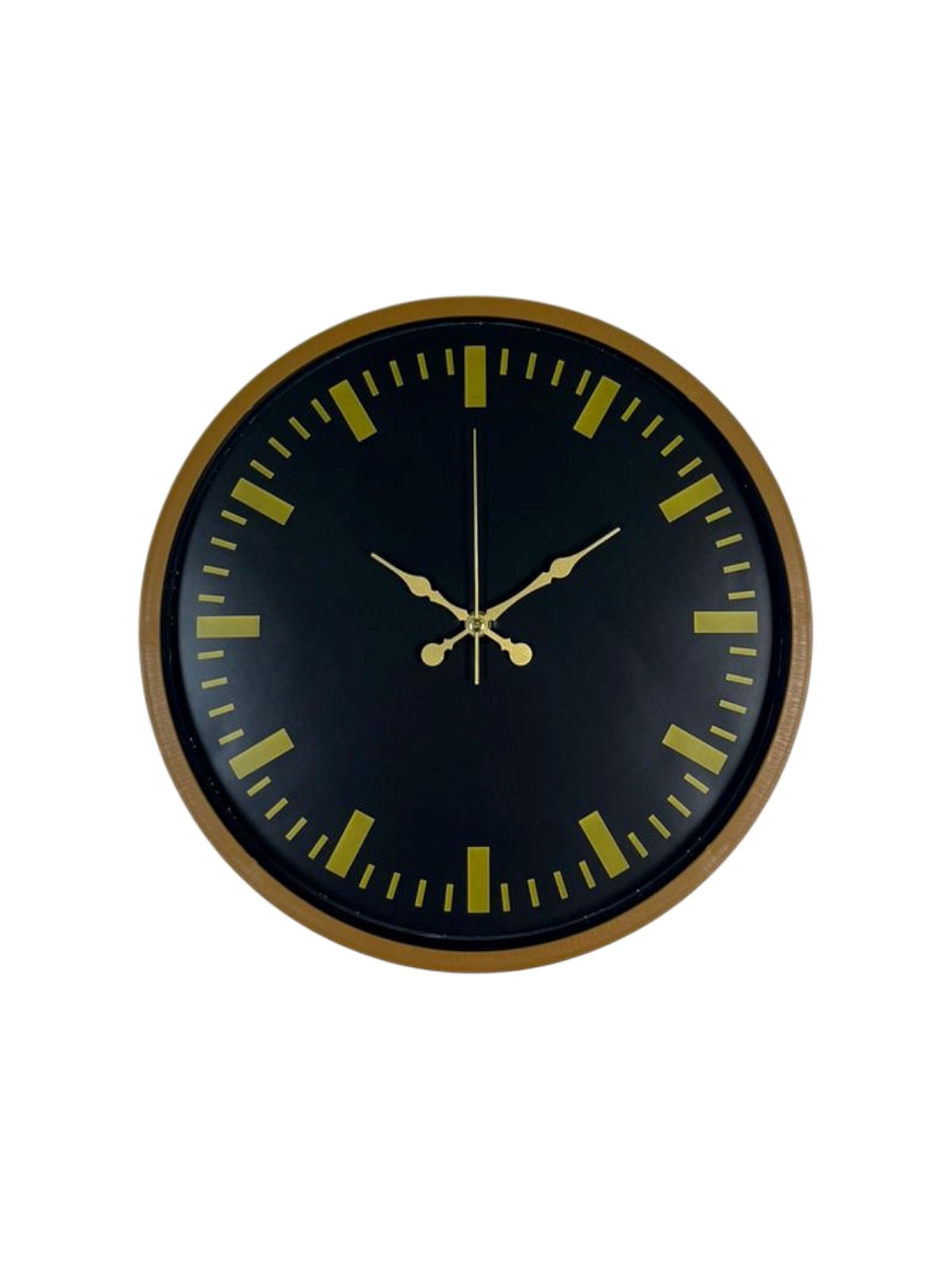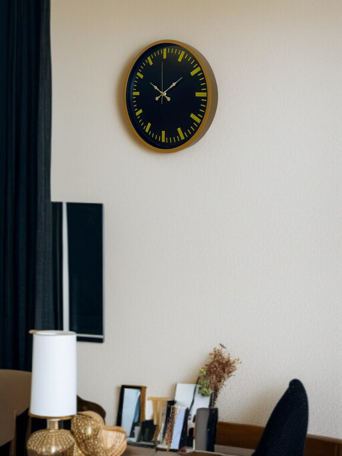 Kahverengi çerçevesi, siyah kadranı ve gold tonlu indeksleriyle tasarlanan bu 36 cm duvar saati; modern çizgileriyle bulunduğu ortama şık ve dengeli bir görünüm kazandırır. Rakam yerine kullanılan gold çizgisel göstergeler, sade ve sofistike bir stil sunarken saatin okunabilirliğini de artırır.