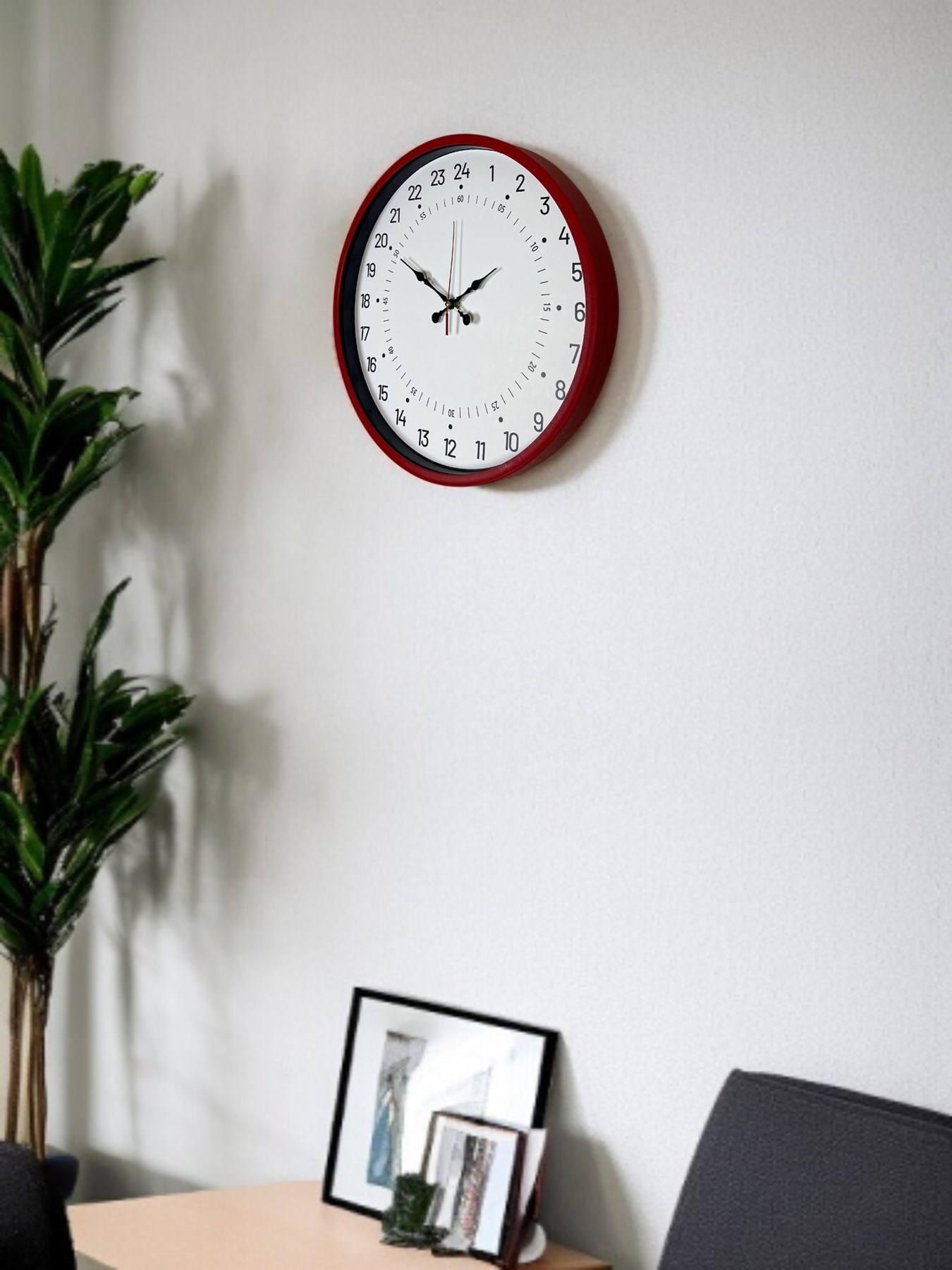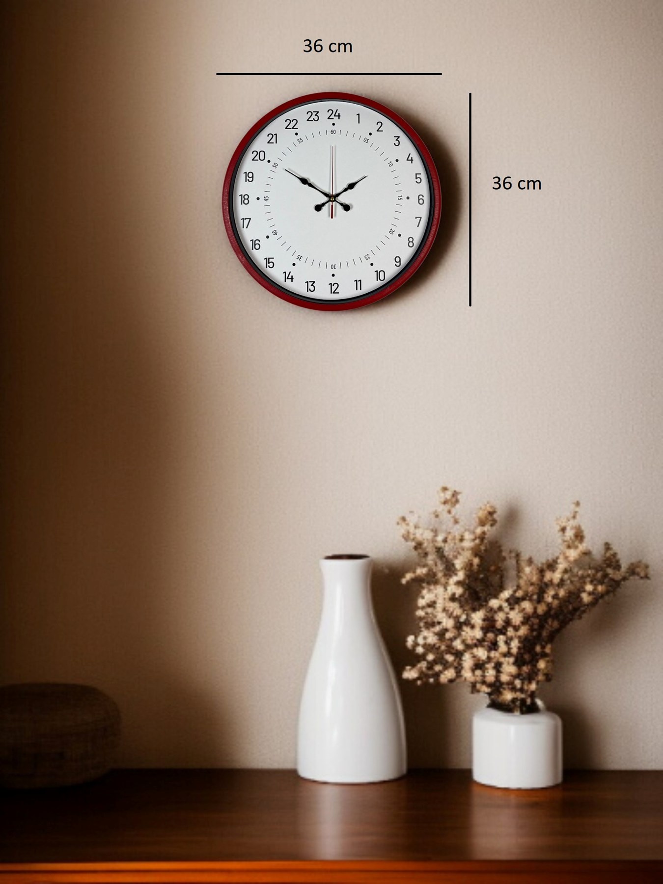 36 cm çapı ile duvarda dengeli ve güçlü bir duruş sergileyen bu kırmızı 24 saat göstergeli duvar saati, klasik saat anlayışının dışına çıkan farklı ve dikkat çekici bir dekorasyon parçasıdır.