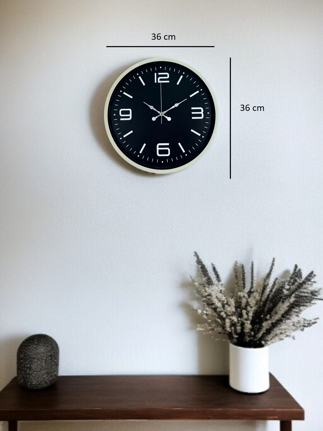 36 cm çapı ile duvarda dengeli ve estetik bir duruş sergileyen bu krem duvar saati; işlevselliği, sessiz çalışması ve modern görünümüyle yaşam alanlarının vazgeçilmez bir parçası olur.