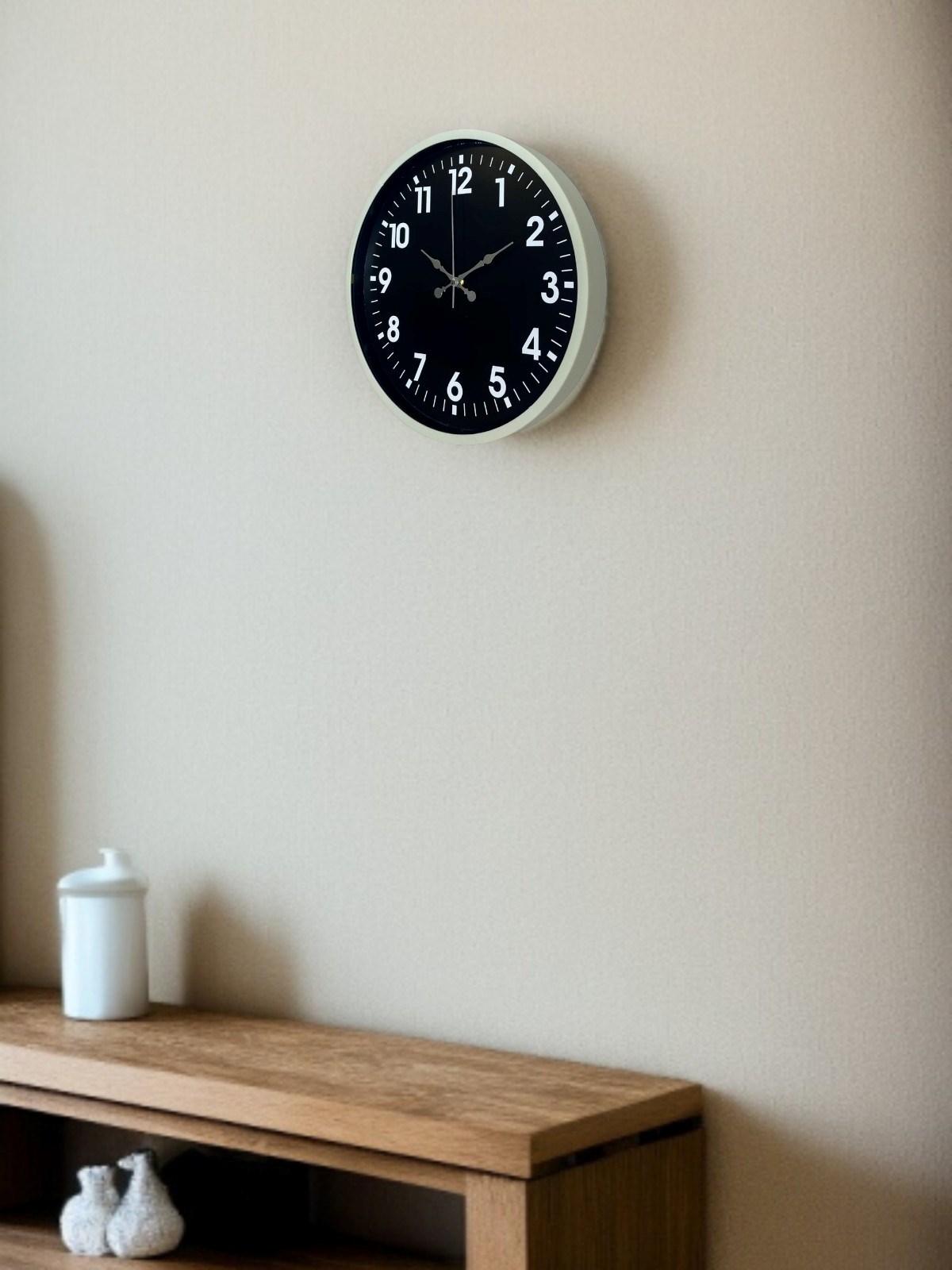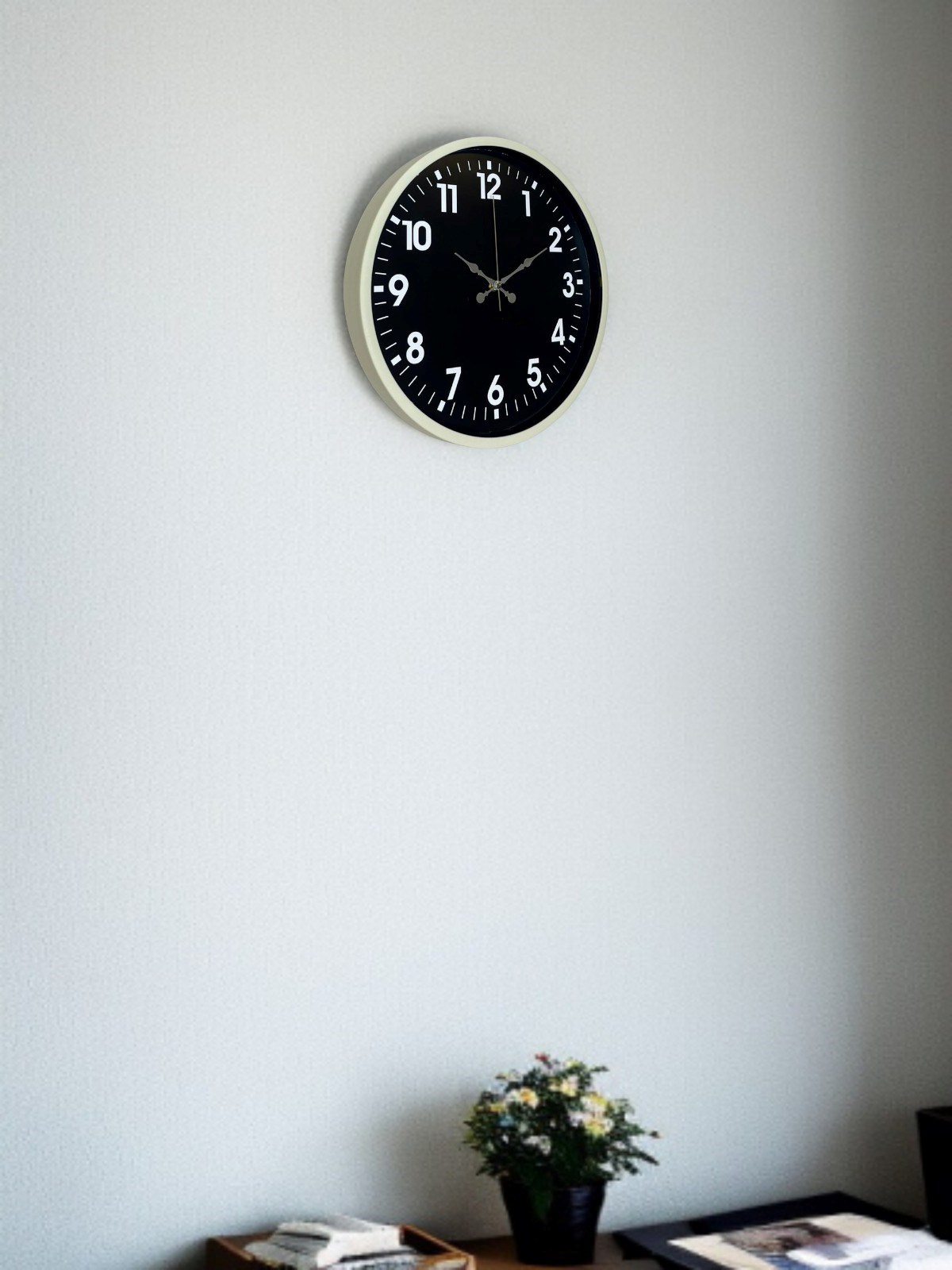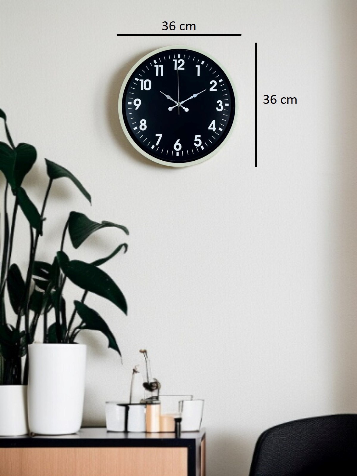 Krem renkli çerçevesi ve siyah zemin üzerindeki büyük beyaz rakamlarıyla tasarlanan bu 36 cm duvar saati, yüksek kontrastlı kadranı sayesinde zamanı tek bakışta net şekilde okumayı sağlar. Sade ve zamansız tasarımı, modern ve klasik dekorasyonlarla uyum içinde kullanıma olanak tanır. Salon, mutfak, ofis ve çalışma alanlarında ferah ve düzenli bir görünüm sunar.