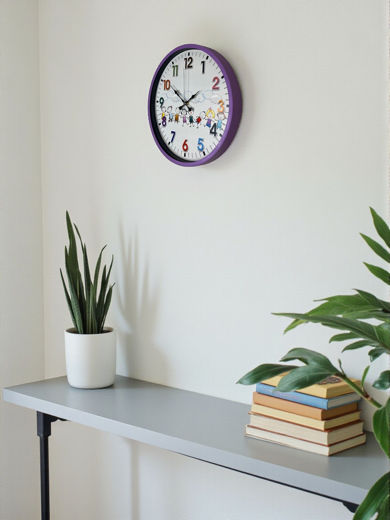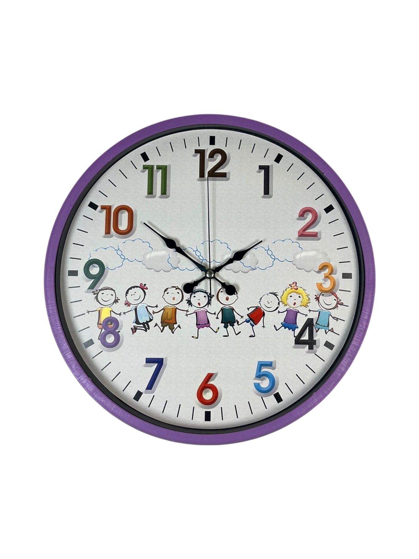 Canlı mor çerçevesi, renkli rakamları ve sevimli çocuk figürleriyle tasarlanan bu 36 cm çocuk odası duvar saati, çocukların yaşam alanlarına neşe ve sıcaklık katar. Eğlenceli tasarımı sayesinde çocukların saat kavramını kolayca öğrenmesine yardımcı olurken, odanın dekorasyonuna da enerjik bir dokunuş kazandırır.