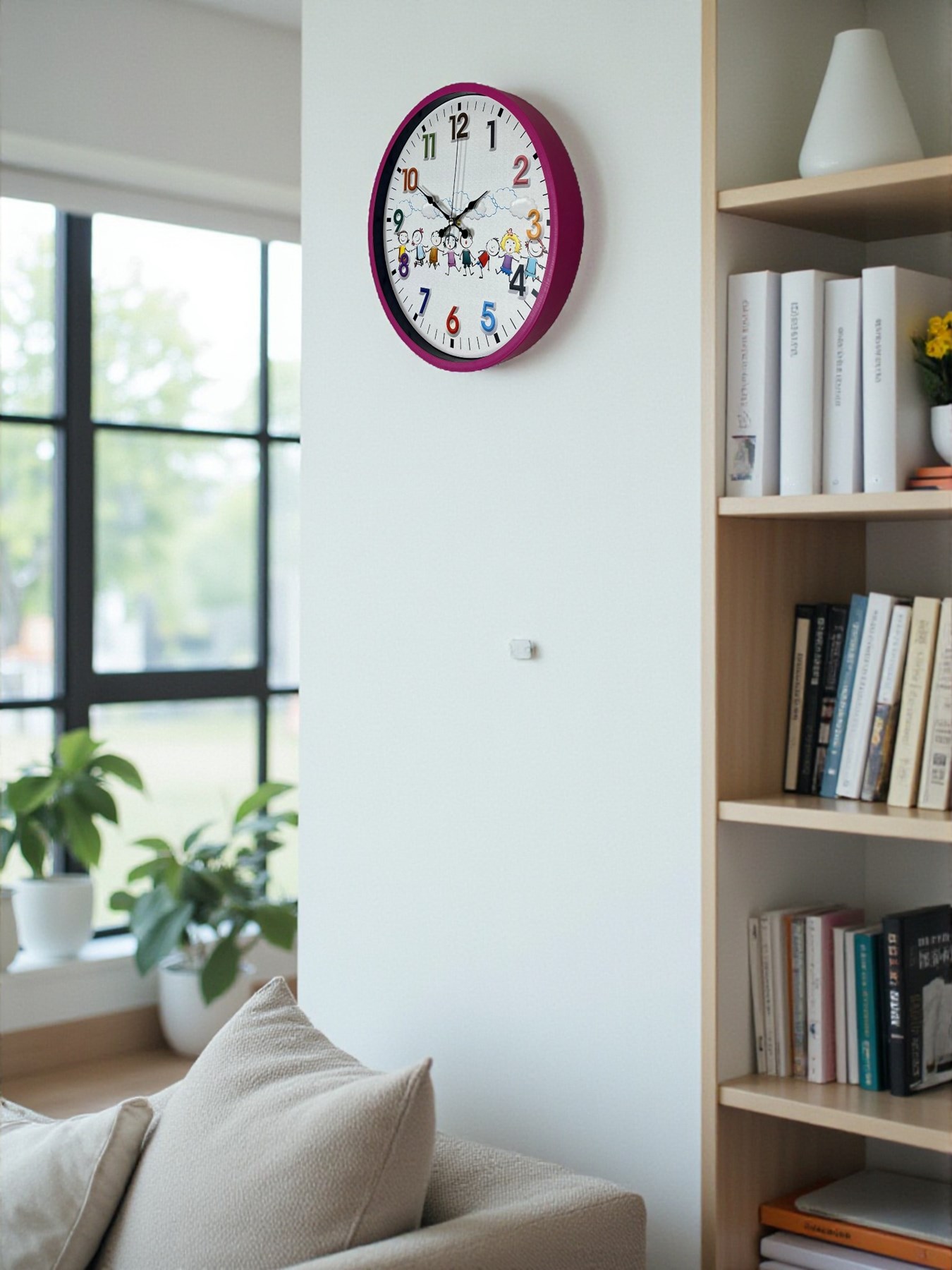 Büyük ve renkli rakamlar, çocukların saati kolayca okuyabilmesini sağlar. Kadran üzerinde yer alan bulutlar ve el ele tutuşan çocuk illüstrasyonları, ürünü hem dekoratif hem de eğitici hale getirir. Sessiz ve akıcı mekanizması, tik-tak sesi oluşturmadığı için çocukların uyku ve ders zamanlarında rahatsızlık vermez.