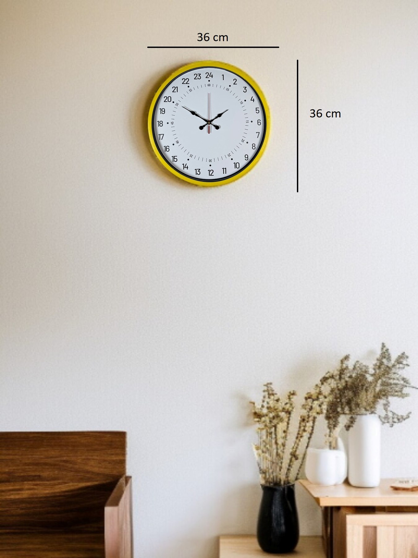 Klasik 12 saatlik saatlerden farklı olarak 24 saatlik zaman dilimini tek kadran üzerinde gösteren bu özel tasarım 36 cm sarı duvar saati, zamanı daha net ve bilinçli takip etmek isteyenler için ideal bir çözümdür. Günün tamamını tek bakışta görme imkânı sunan yapısı sayesinde, saat algısını güçlendirir ve alışılmışın dışında bir kullanım deneyimi sağlar.