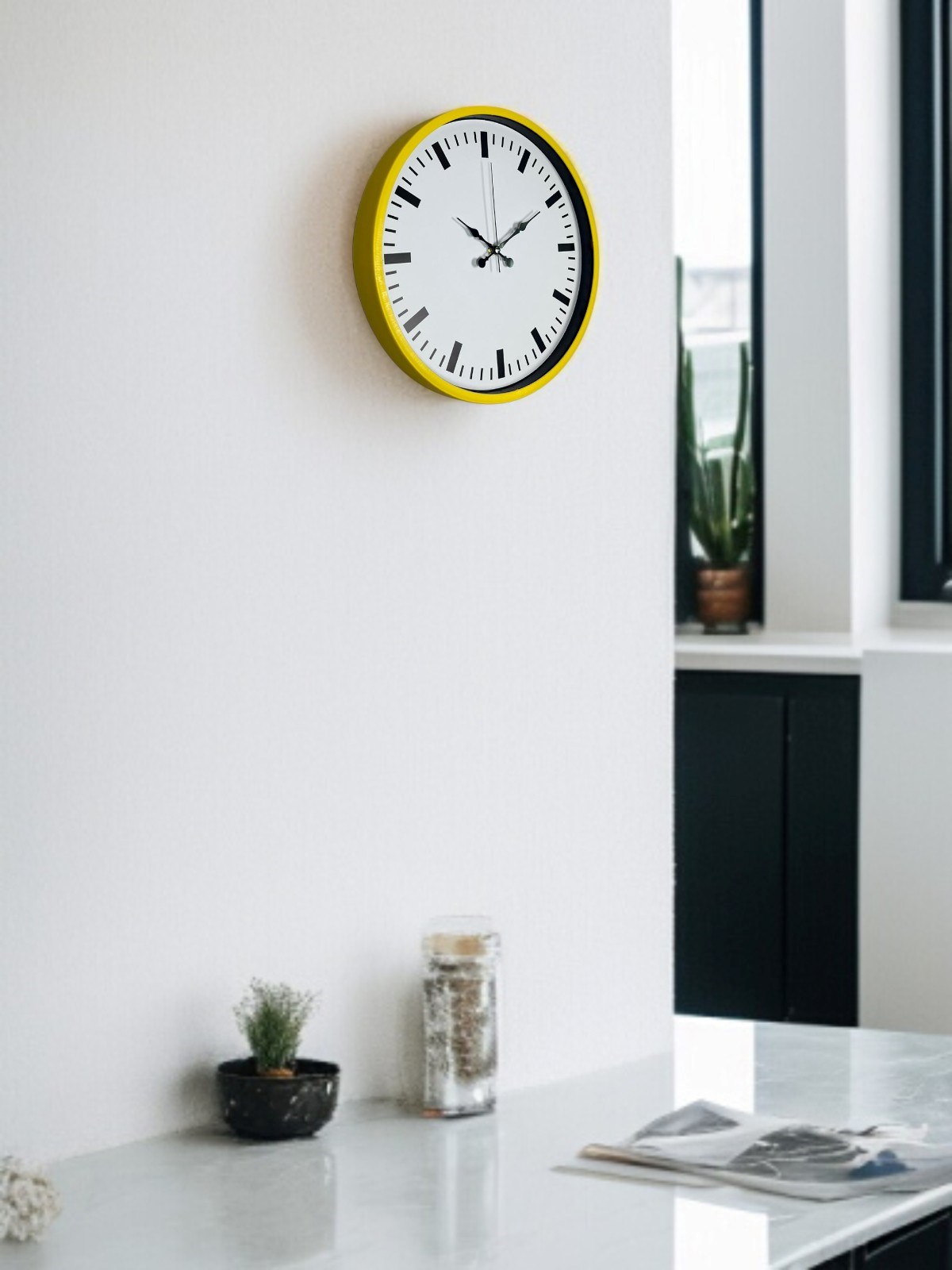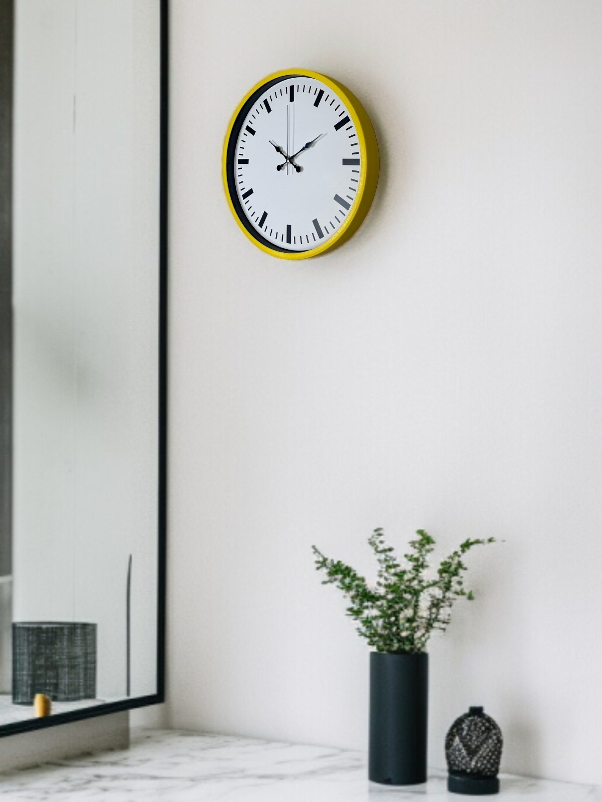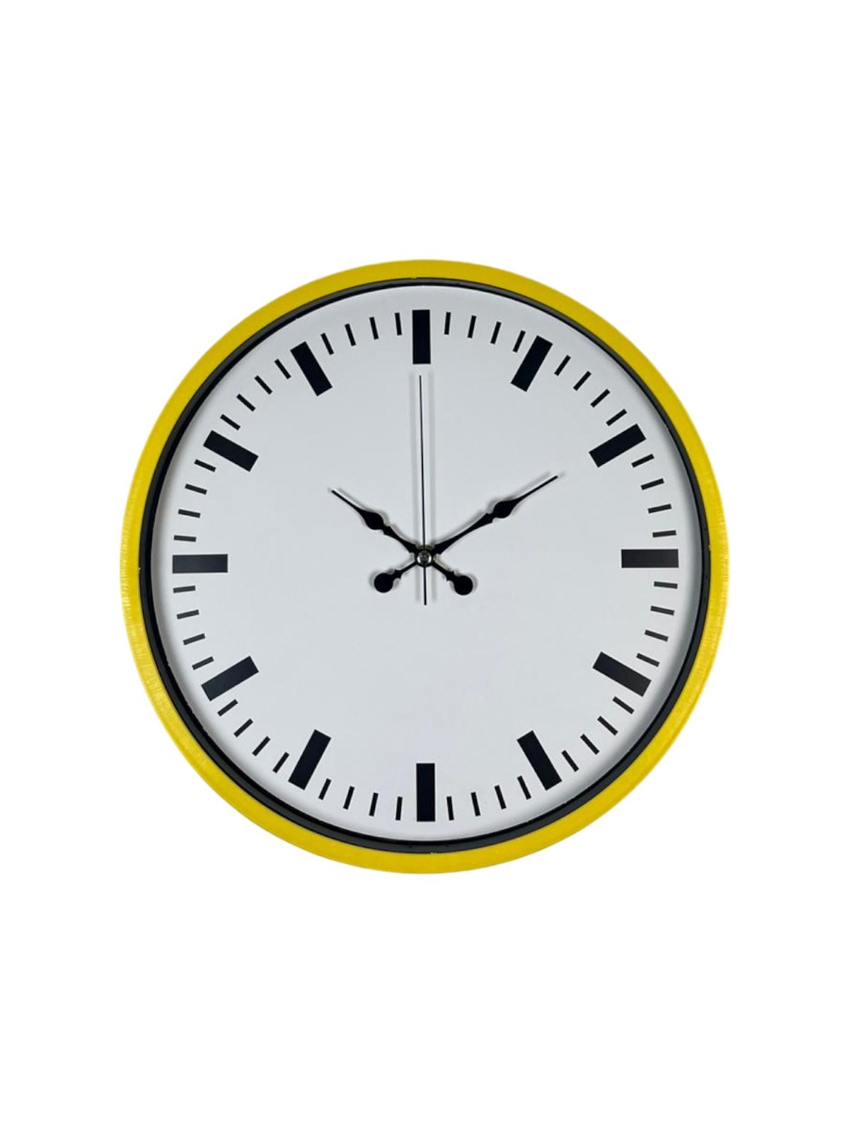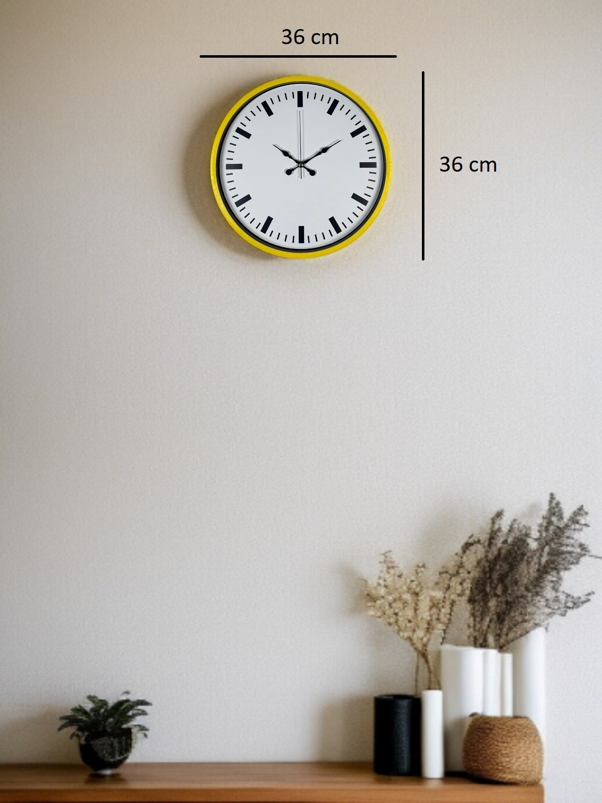 Canlı sarı çerçevesi ve sade beyaz kadranı ile tasarlanan bu 36 cm duvar saati, bulunduğu ortama ferah ve enerjik bir hava katar. Net siyah indeksleri sayesinde saati uzaktan bile kolayca okumak mümkündür.