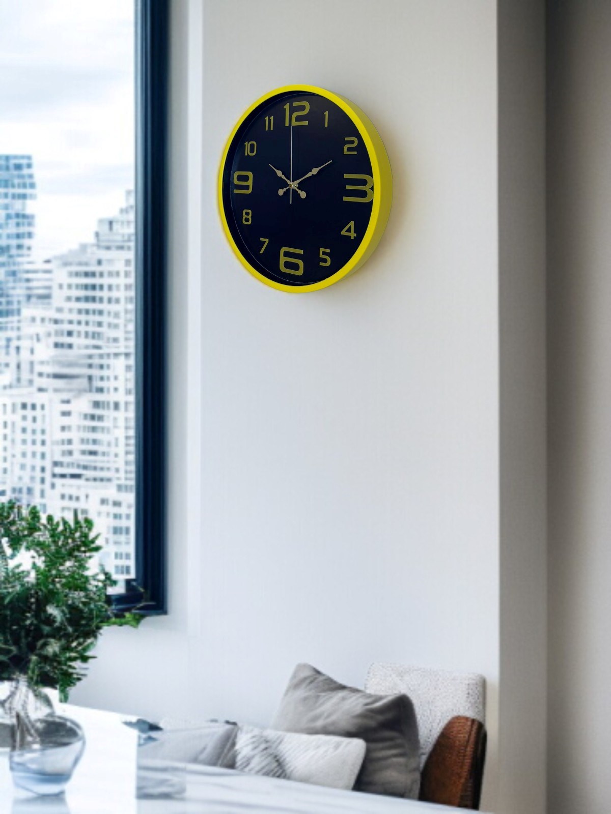 Canlı sarı çerçevesi ve koyu renk kadran tasarımıyla öne çıkan bu 36 cm duvar saati, bulunduğu ortama enerji ve modern bir karakter kazandırır. Altın tonlu rakamları ve kontrastlı kadran yapısı sayesinde saati uzaktan bile rahatlıkla okumak mümkündür.