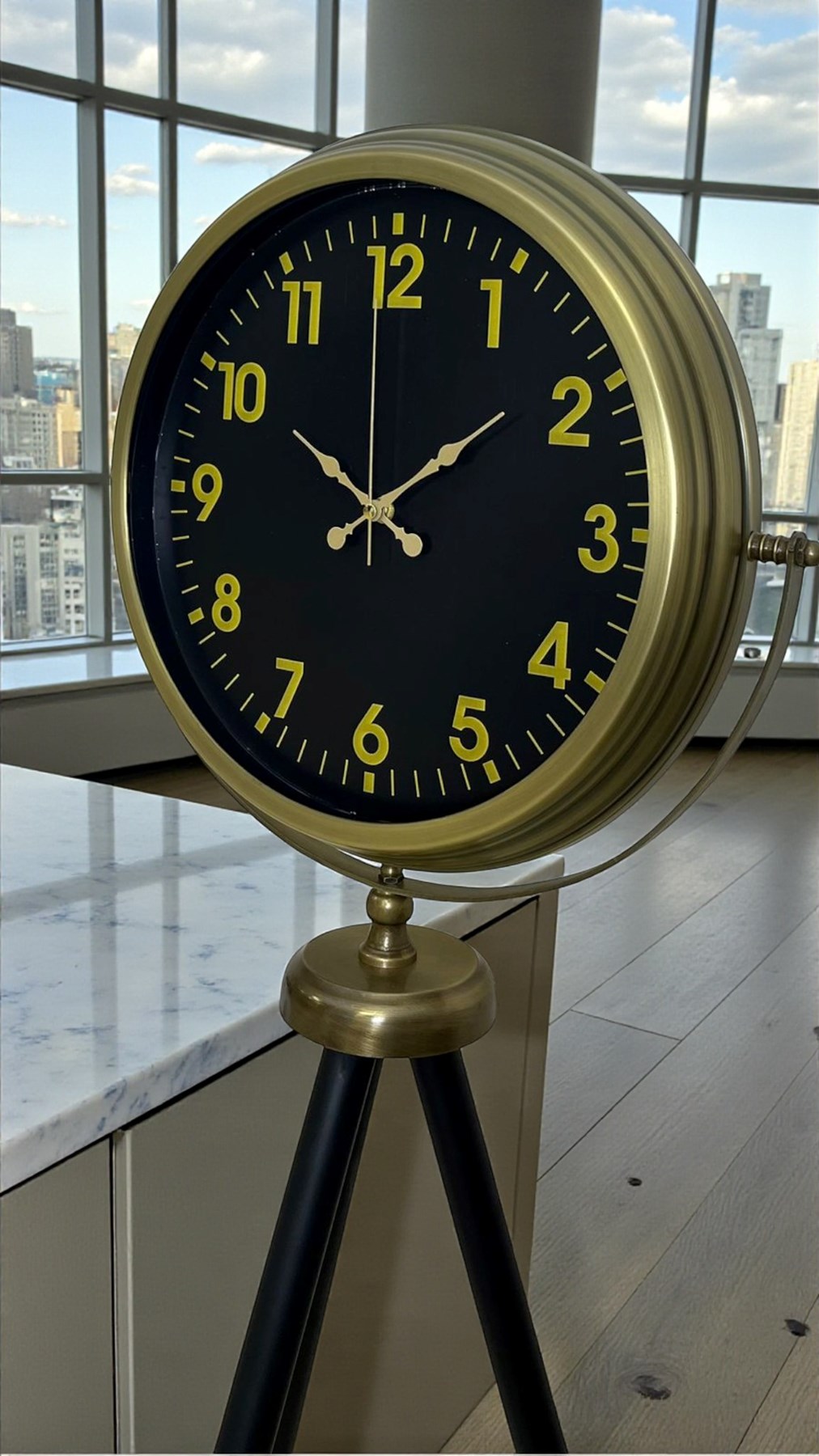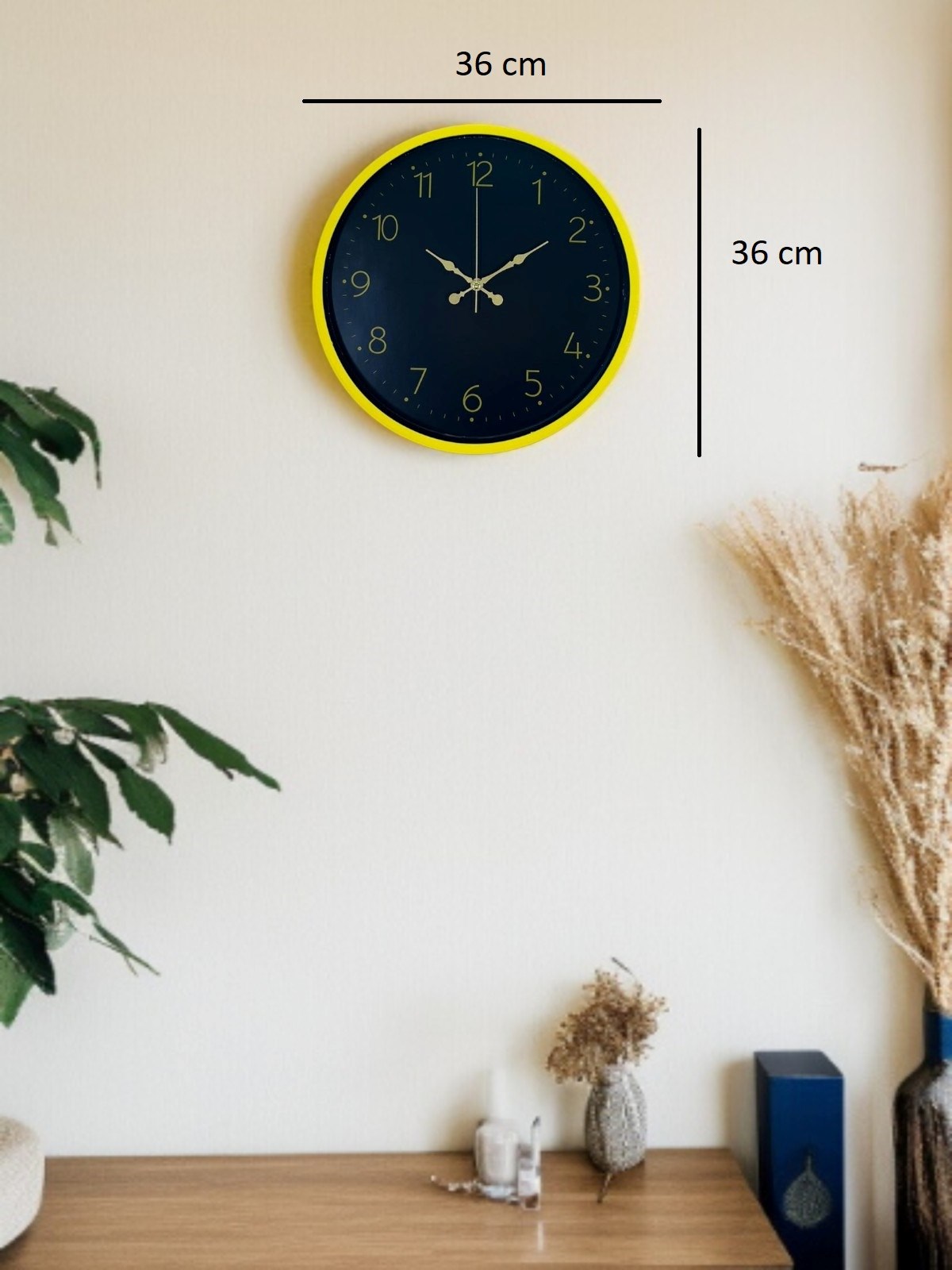 Canlı sarı çerçevesi ve koyu renk kadran tasarımıyla öne çıkan bu 36 cm duvar saati, bulunduğu ortama enerji ve modern bir karakter kazandırır. Altın tonlu rakamları ve kontrastlı kadran yapısı sayesinde saati uzaktan bile rahatlıkla okumak mümkündür.