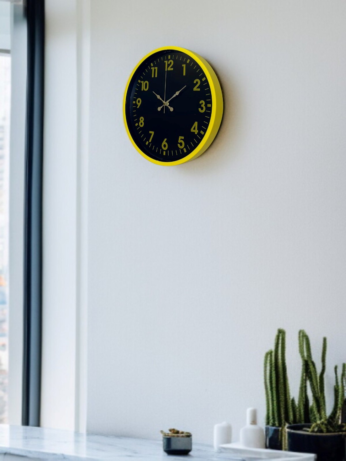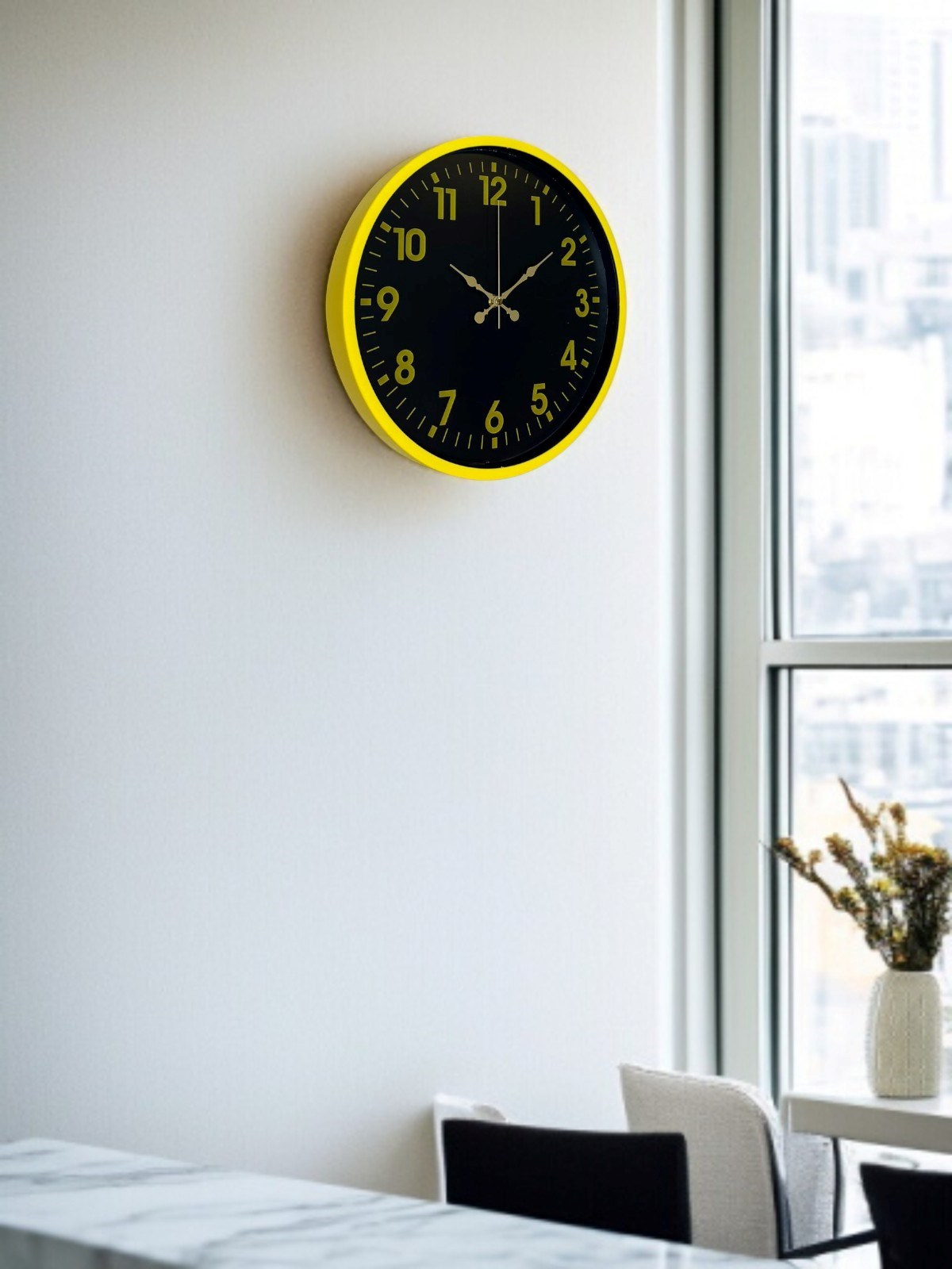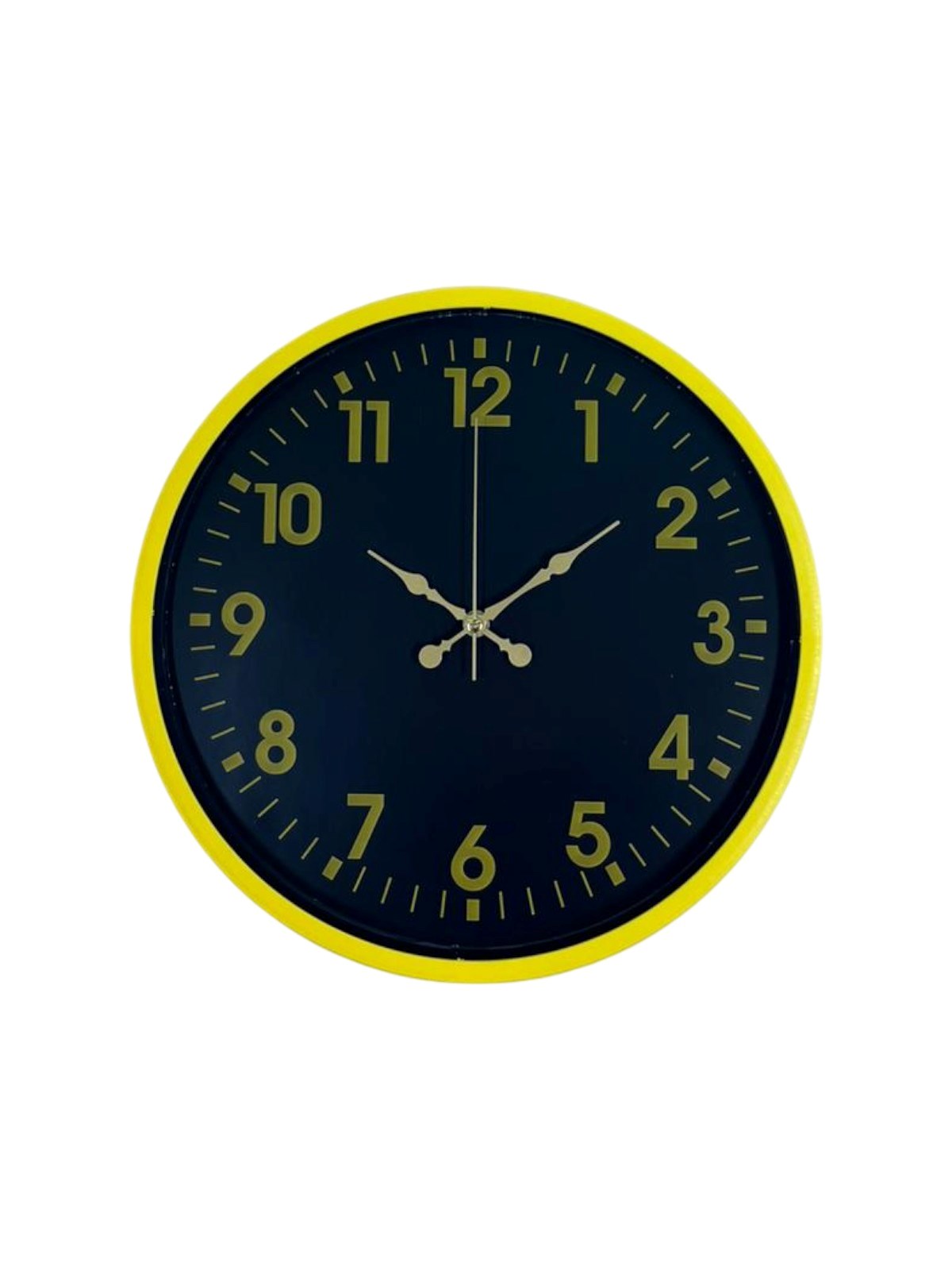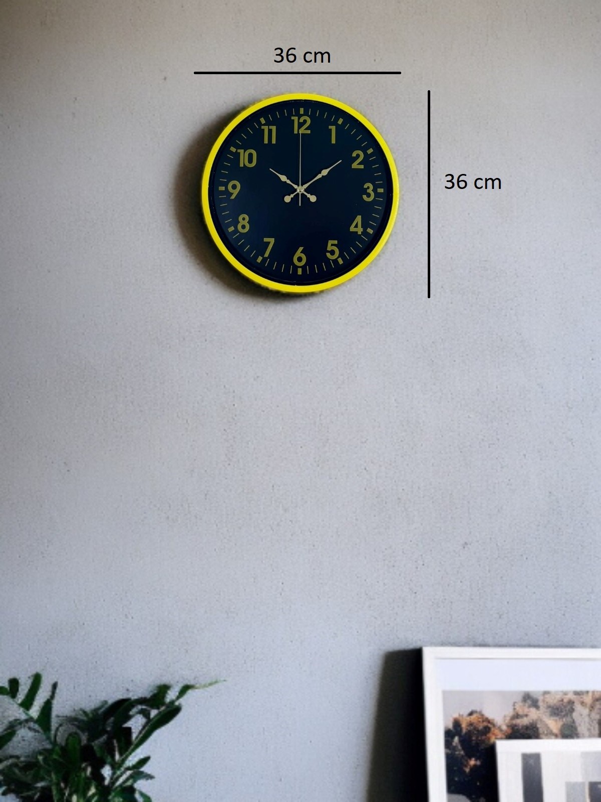 Canlı sarı çerçevesi ve koyu renk kadran tasarımıyla öne çıkan bu 36 cm duvar saati, bulunduğu ortama enerji ve modern bir karakter kazandırır. Altın tonlu rakamları ve kontrastlı kadran yapısı sayesinde saati uzaktan bile rahatlıkla okumak mümkündür.