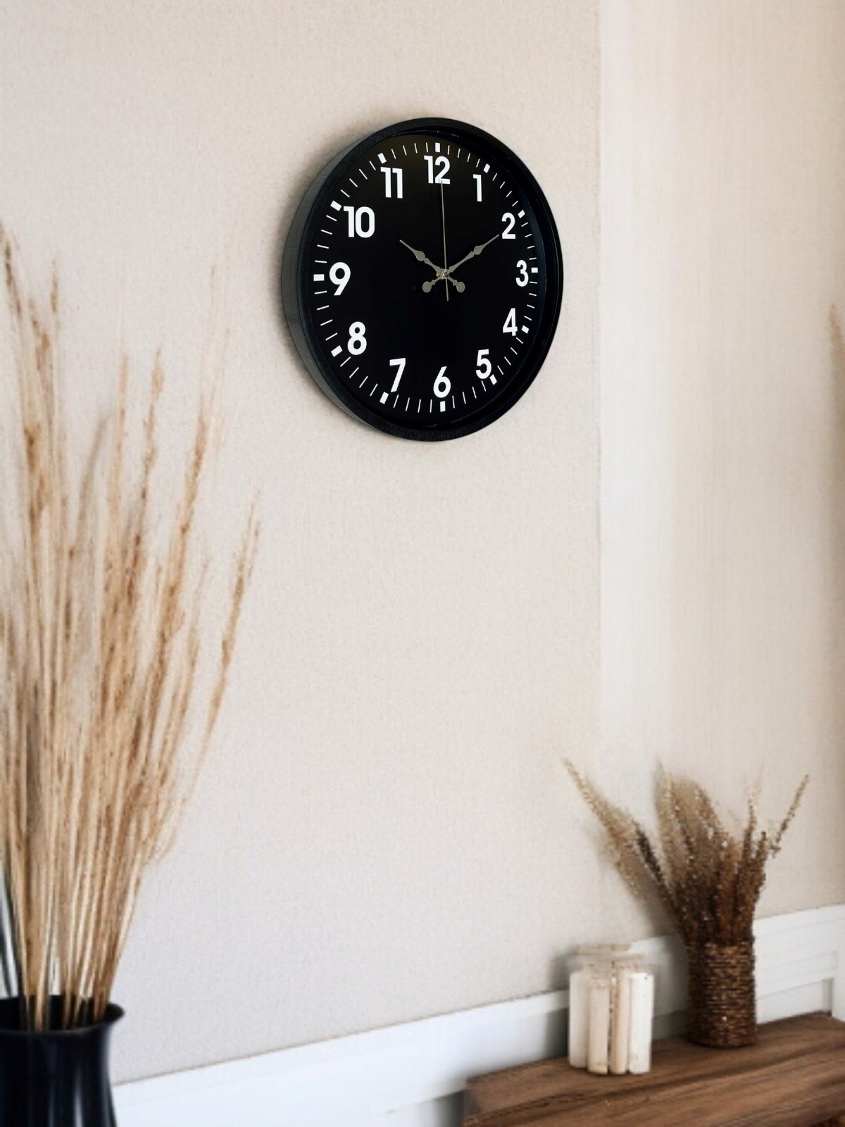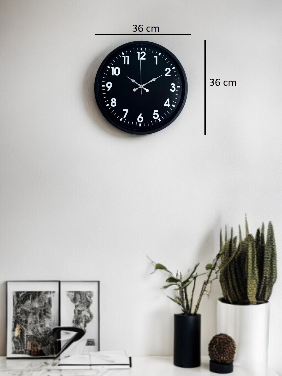 Siyah çerçevesi ve koyu kadranı üzerinde yer alan beyaz rakamları ile tasarlanan bu 36 cm duvar saati, güçlü kontrastı sayesinde saati uzaktan dahi net şekilde okumayı mümkün kılar. Minimal ve sade tasarımıyla her türlü dekorasyona kolayca uyum sağlar.