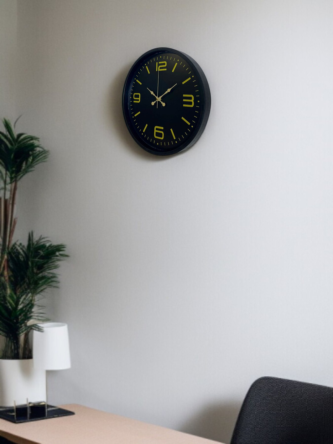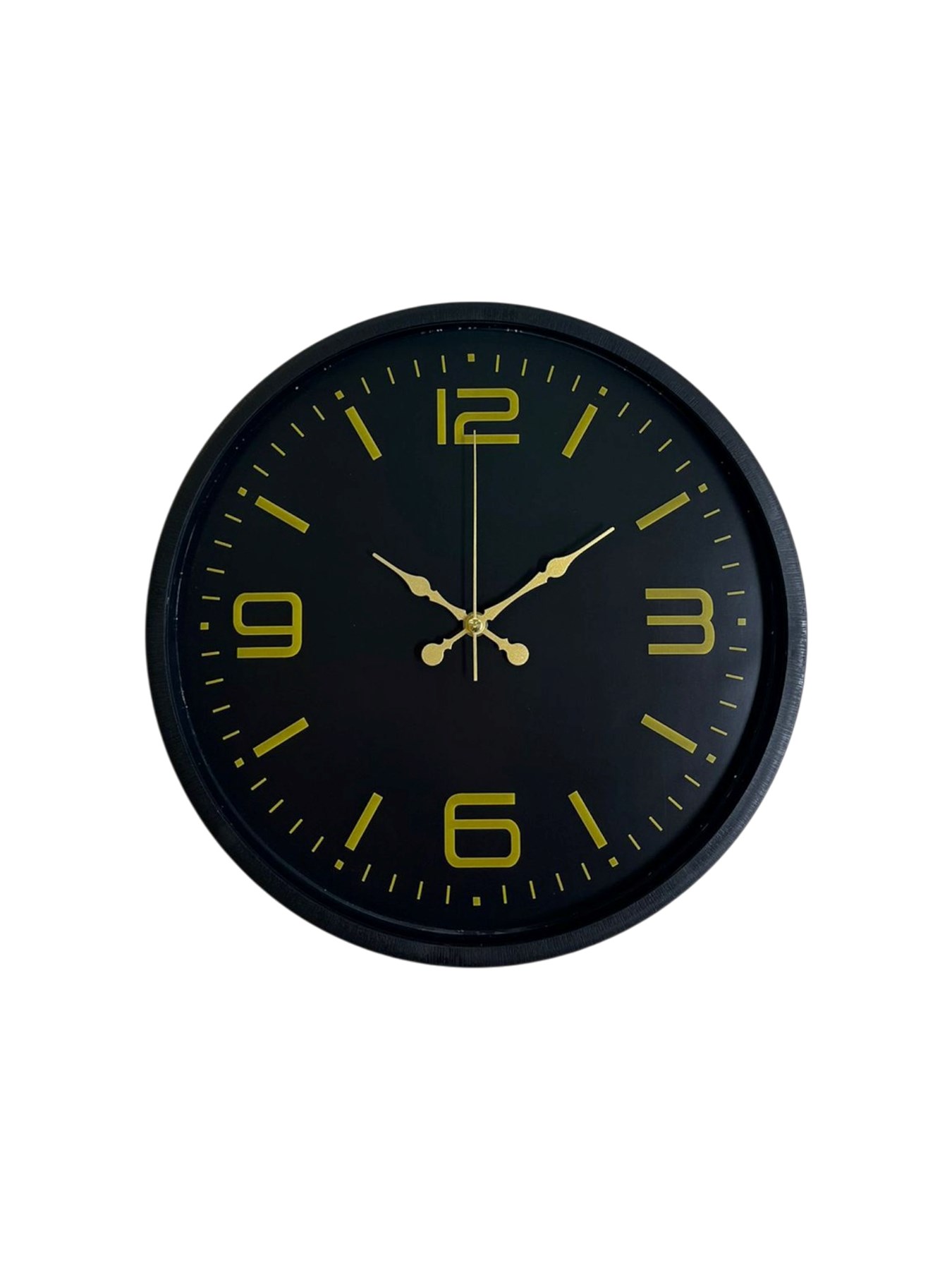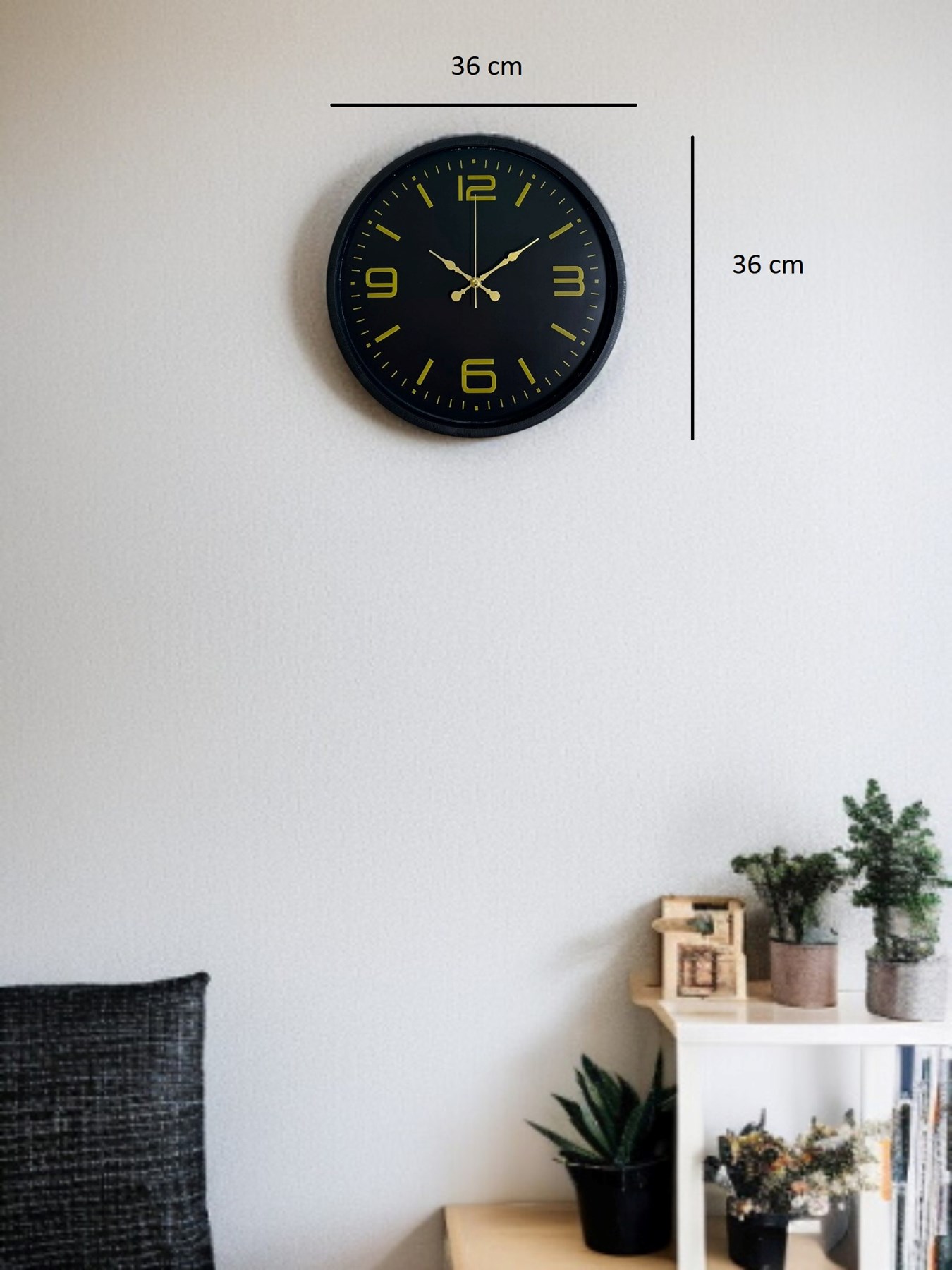 Siyah çerçevesi ve mat siyah kadranı üzerinde yer alan gold tonlu rakam ve indeksleri ile tasarlanan bu 36 cm duvar saati, modern ve şık bir duruş sunar. Minimal çizgilerle tasarlanmış kadranı, sade ama etkileyici bir dekoratif görünüm sağlar.