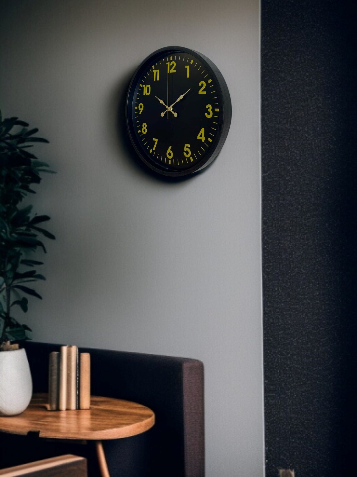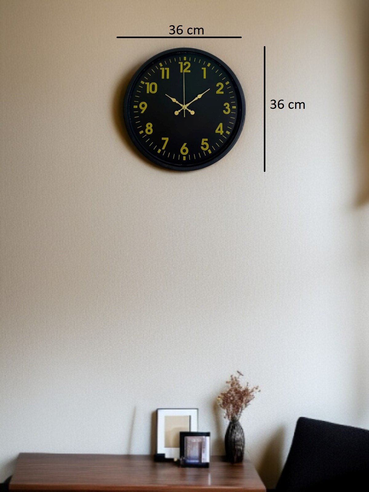 Siyah çerçevesi ve koyu kadranı üzerinde yer alan altın tonlu rakam ve ibreleri ile tasarlanan bu 36 cm duvar saati, zamansız bir şıklık sunar. Yüksek kontrastlı kadran yapısı sayesinde saati uzaktan dahi net ve rahat bir şekilde okumak mümkündür.