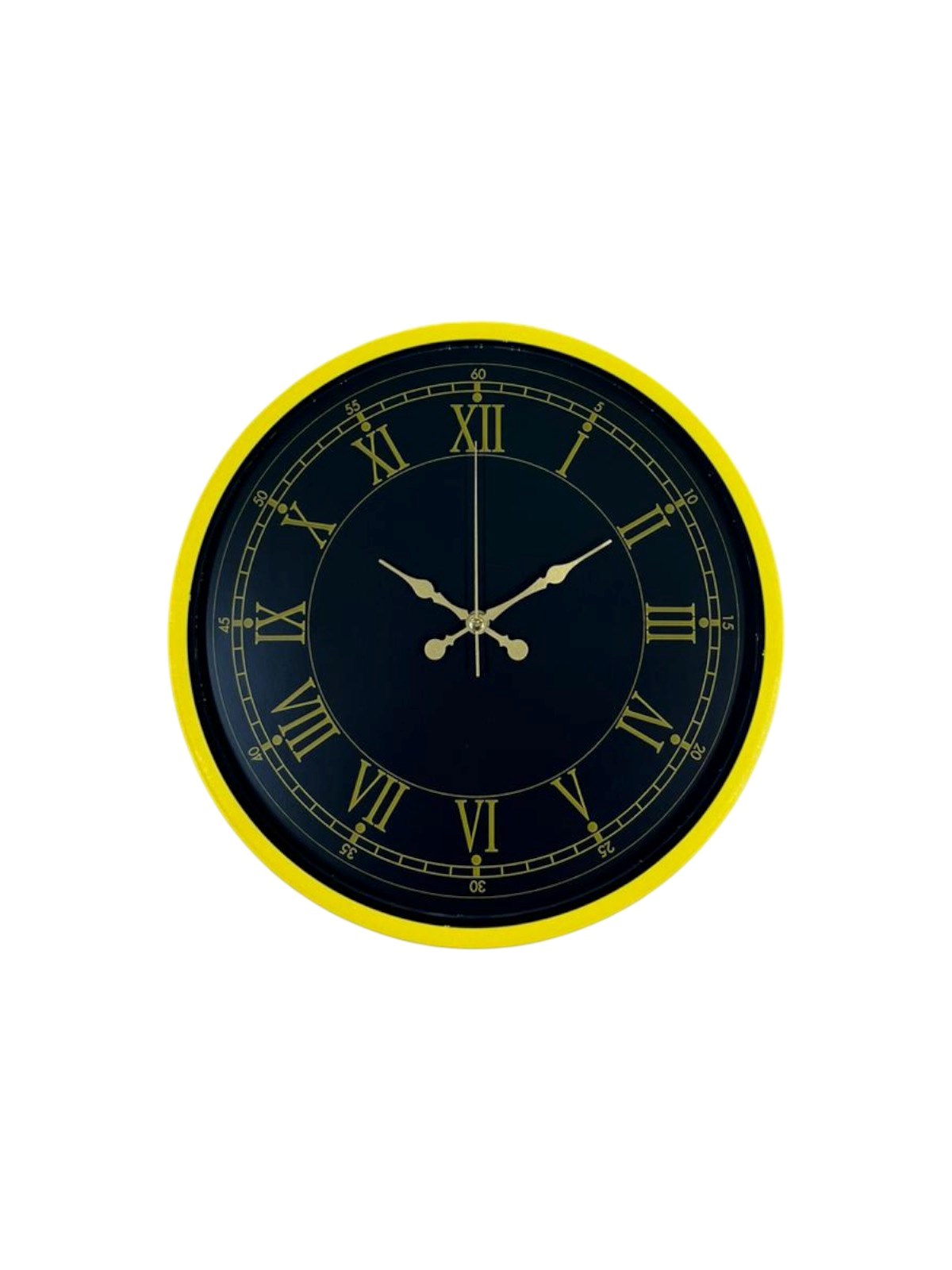 Canlı sarı çerçevesi ve siyah zemin üzerine gold Roma rakamlı tasarımıyla bu 36 cm duvar saati, bulunduğu ortama enerjik ve şık bir hava katar. Kontrast renk uyumu sayesinde hem uzaktan kolay okunur hem de dekoratif bir odak noktası oluşturur.