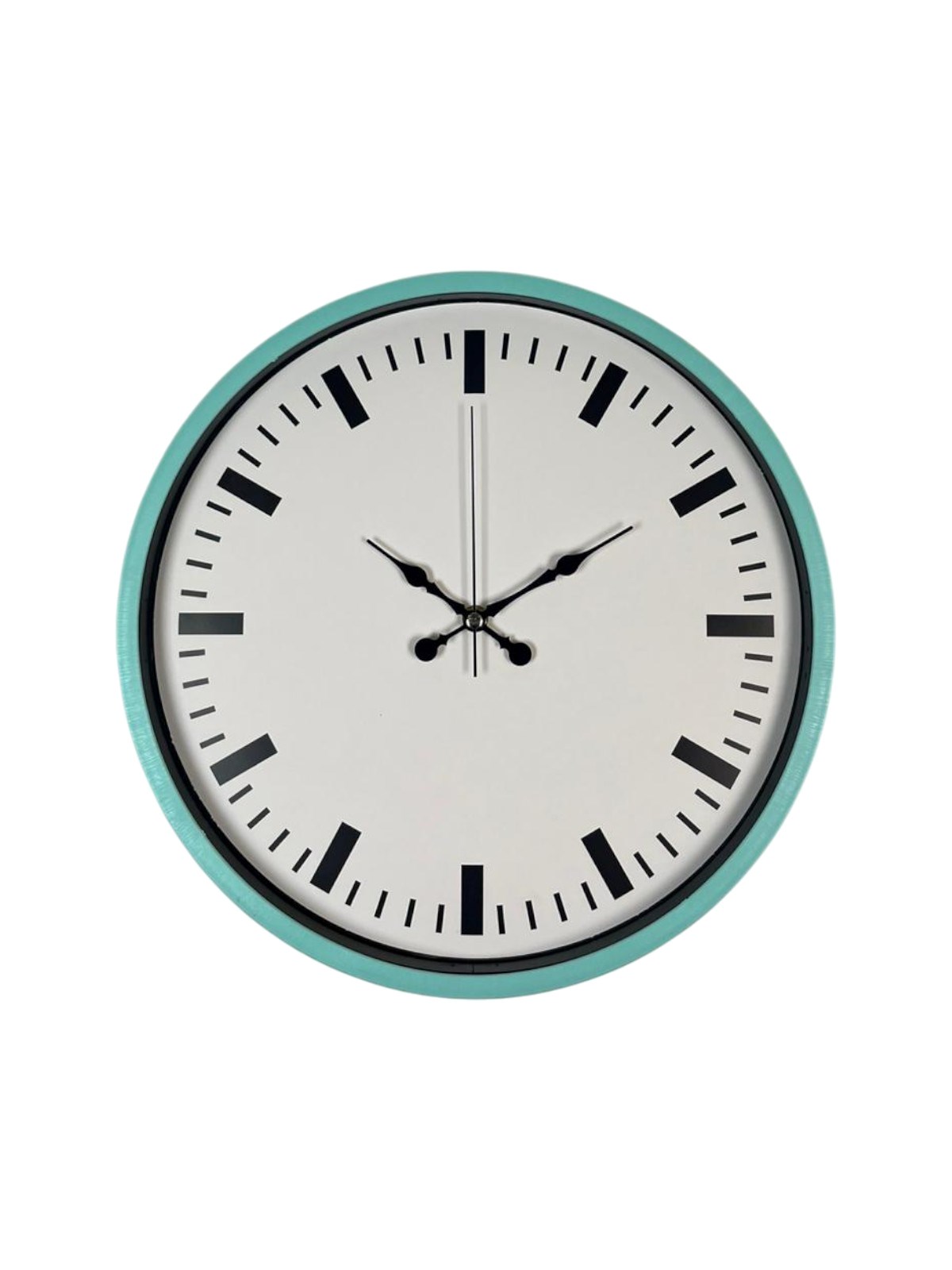 Turkuaz çerçevesiyle bulunduğu ortama canlılık ve ferahlık katan bu 36 cm duvar saati, sade kadran tasarımıyla modern dekorasyonlara şık bir uyum sağlar. Beyaz zemin üzerine yerleştirilen siyah çizgi indeksler, saatin okunurluğunu artırırken minimal bir görünüm sunar.