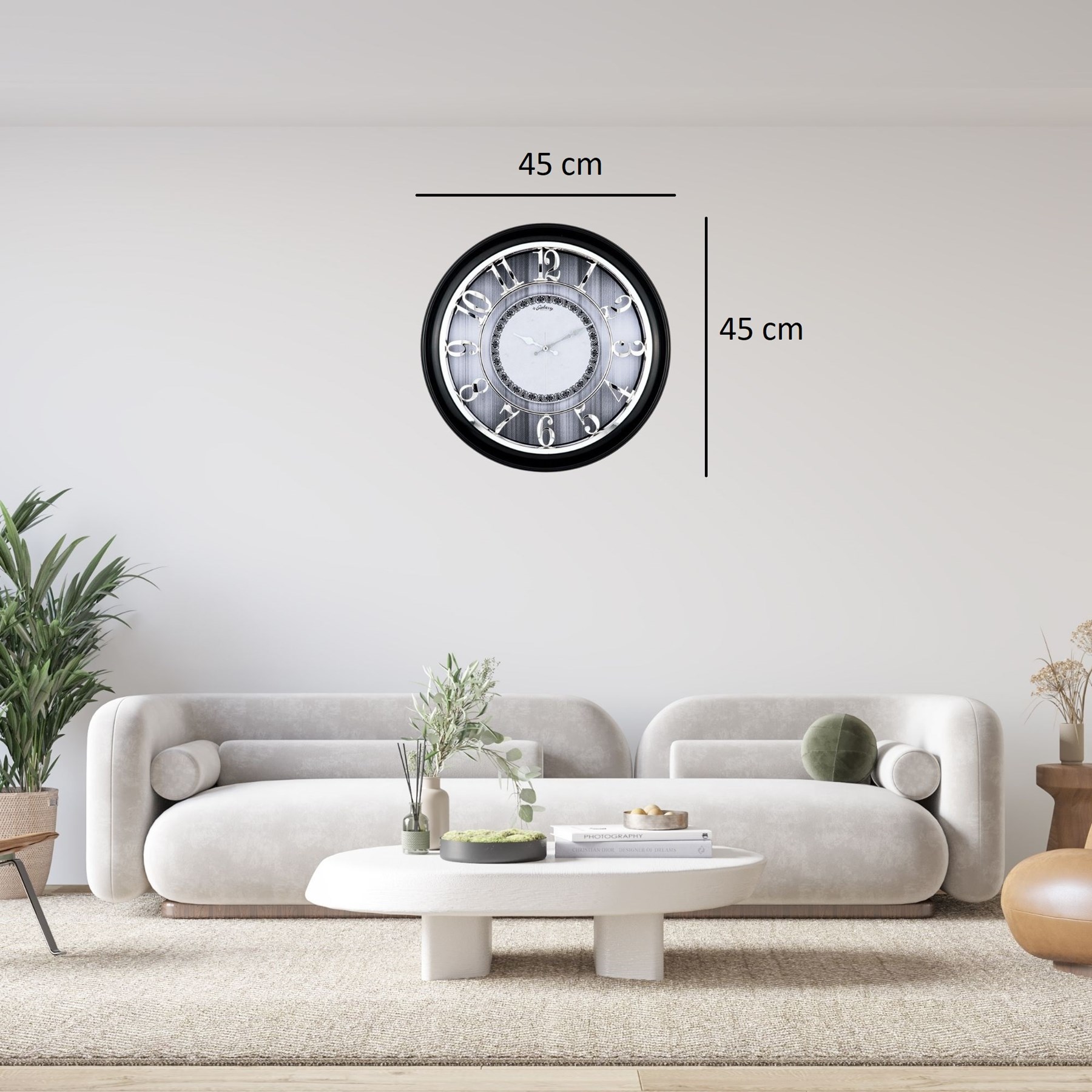 Modern çizgilere sahip gri desenli kadranı ve parlak rakam detayları sayesinde hem klasik hem de modern dekorasyonlara uyum sağlar. Salon, oturma odası, ofis, mutfak ve çalışma alanlarında dekoratif bir tamamlayıcı olarak kullanılabilir.