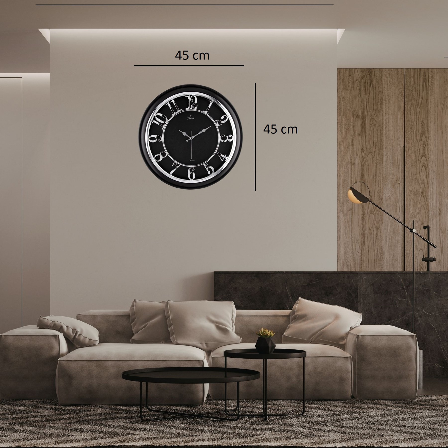 Şık ve modern tasarımıyla dikkat çeken Galaxy 45 cm Dekoratif Duvar Saati, yaşam alanlarınıza estetik ve zarif bir dokunuş kazandırır. Geniş çapı ve büyük rakamlı kadran tasarımı sayesinde saat kolayca okunabilir ve dekoratif bir görünüm sunar.