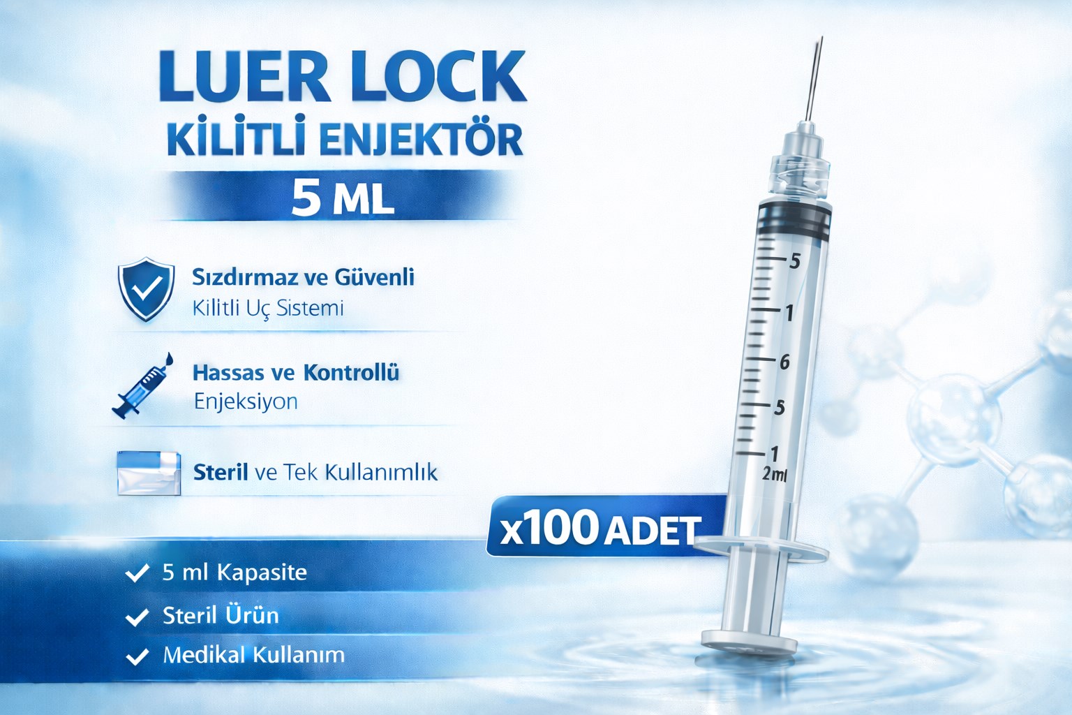 5 ml Luer Lock enjektör, sıvı uygulamalarında güvenli kilitleme sistemi ile öne çıkar. Kilitli uç yapısı sayesinde iğne bağlantısı sabitlenir ve kontrollü enjeksiyon imkanı sunar. Hastane, laboratuvar ve medikal kullanım için uygundur. 25 adet, 50 adet, 75 adet ve 100 adet paket seçenekleri mevcuttur.