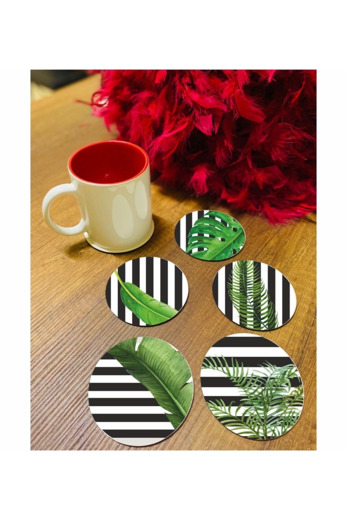 - Doğal ahşap malzemesiyle üretilmiş, dayanıklı ve uzun ömürlü kullanım sunar; - 6 parça set halinde sunulan bu bardak altlıkları, birden fazla bardak için idealdir ve masa düzeninizi kolayca korumanızı sağlar; - Yeşil yaprak desenleriyle estetik bir görünüm kazandırarak sofra düzeninize şıklık katar; - Ahşap yapısı sayesinde sıcak içeceklerinizi güvenle kullanabileceğiniz bir yüzey sunar;
