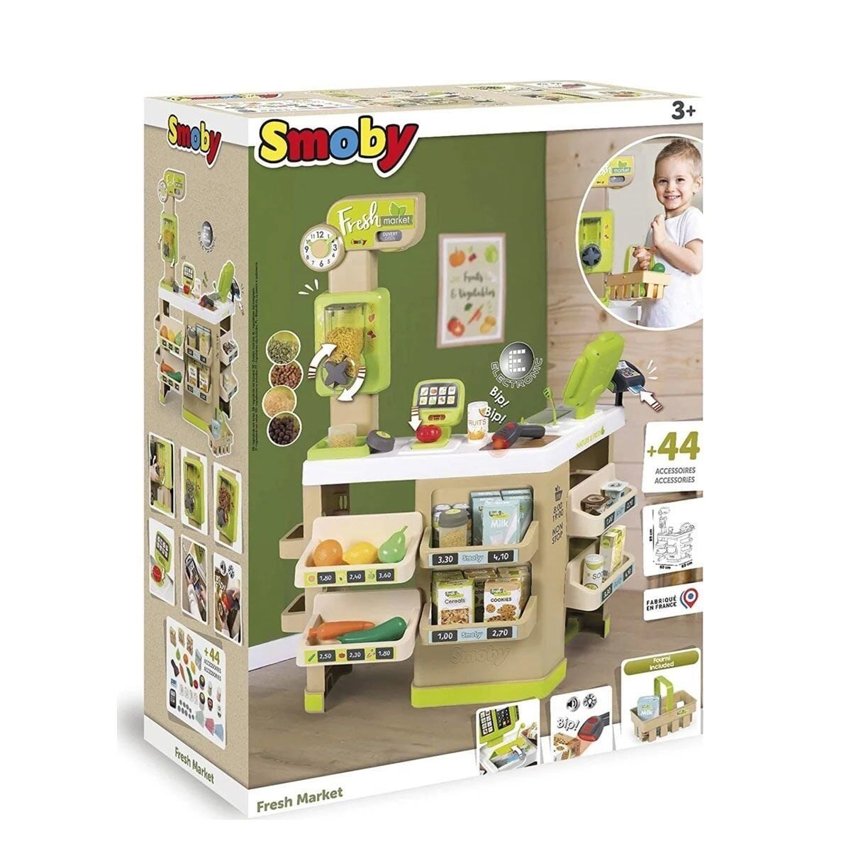 Oyun fonksiyonlarını geliştirmek için birçok aksesuar dahildir: 4 kukla kutu, 6 meyve ve sebze, 2 yoğurt kabı, 2 kutu, 2 kavanoz, 1 sesli ve ışıklı elektronik barkod okuyucu, 1 banka kartı, 4 sebze, 2 yoğurt kabı, 2 bidon, 2 kavanoz, 1 sesli ve ışıklı elektronik barkod okuyucu, 1 banka kartı, 4 fiş, 9 madeni para, 12 banknot ve 1 sepet.
