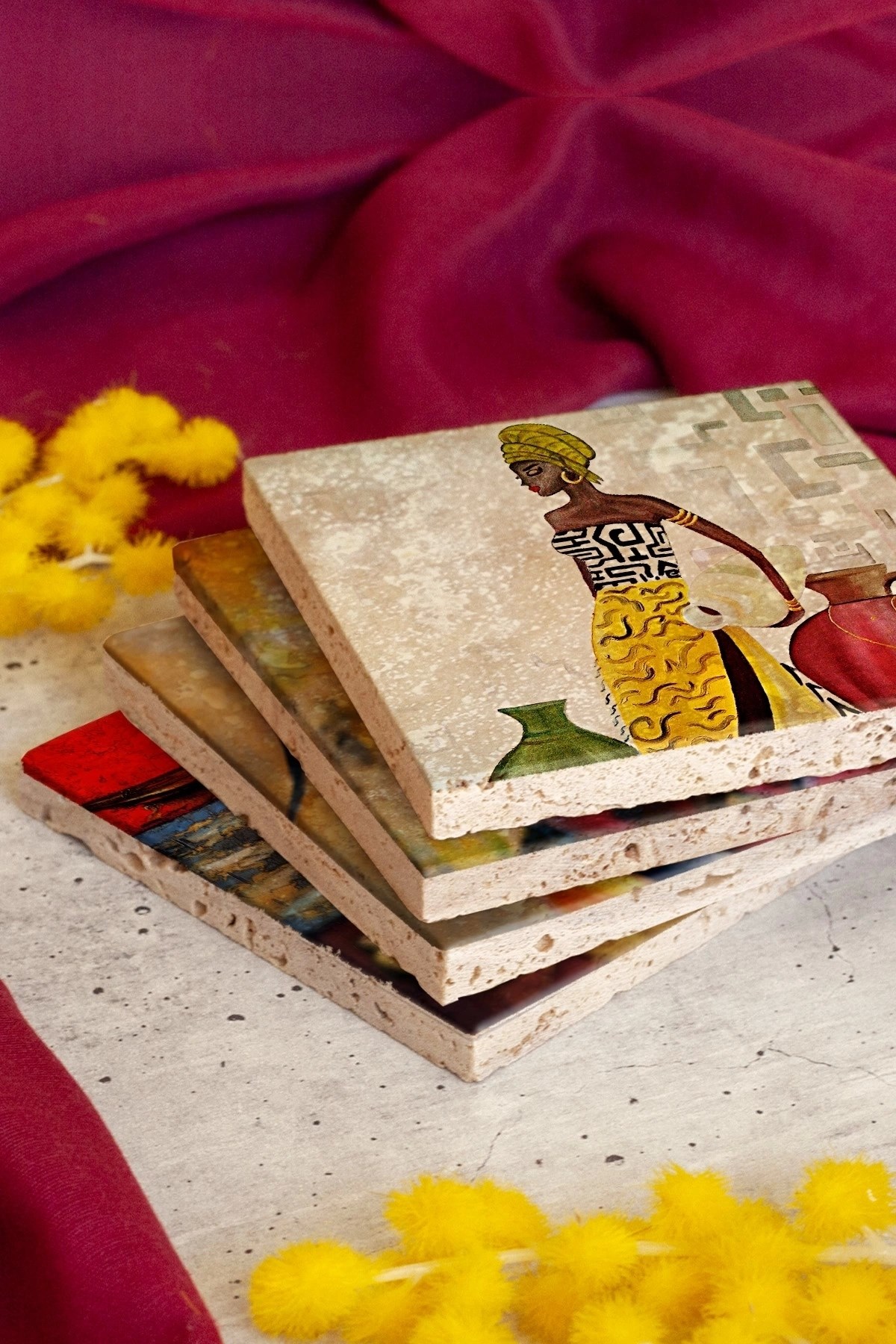 4'lü set olarak gönderilir. Her bir taş 10cm x10 cm ebatındadır.; Taş Bardak Altlıklarının her birinin arkasında koruyucu bulunmaktadır. Çizilmelere karşı korunaklıdır.; Kullanılan malzeme dağlardan çıkan gerçek taş olduğu için taşın yüzeyinde belli oranda gözenek bulunabilir ve girinti-çıkıntı olabilir.; Taşın doğal halinde krem rengi tonların bulunmasından dolayı ürün görselinde renk tonu farklılıkları olabilir.; Taşların yüzeyinde özel bir baskı yöntemi kullanılmaktadır.; Kimyasal malzeme teması yüzeyde deformasyona neden olabilir. Bu nedenle ürünler nemli bezle silinerek temizlenmelidir.; Bardak Altlıklarımızın üretimi kendi atölyemizde tarafımızca gerçekleştirilmektedir.; Özenle ambalajlanan ürünlerimiz, sorunsuz biçimde size ulaştırılmak üzere kargolanması yapılır.;