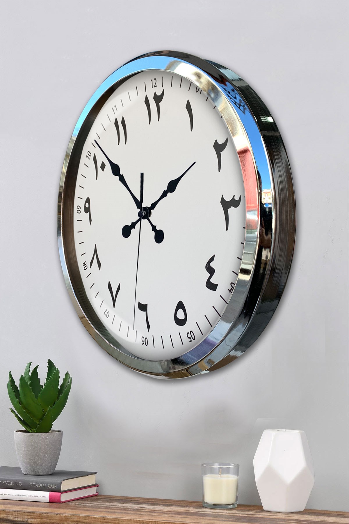 Modern tasarımın sade şıklığını bir araya getiren bu 52 x 52 cm büyük boy duvar saati, dekoratif görünümü ve kaliteli malzemesiyle ev ve iş yerlerinde zamana estetik bir dokunuş kazandırır. Parlak krom çerçevesi, minimal kadranı ve net rakamlarıyla özellikle geniş duvarlarda oldukça dikkat çeker.