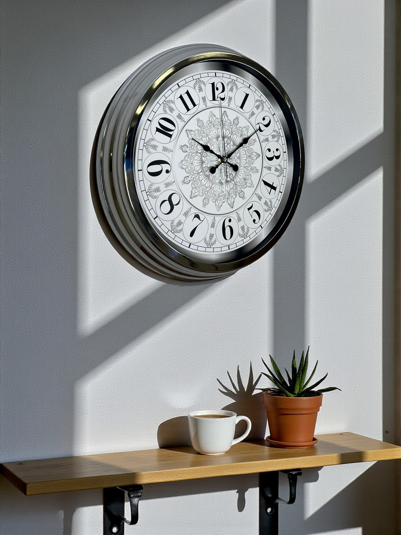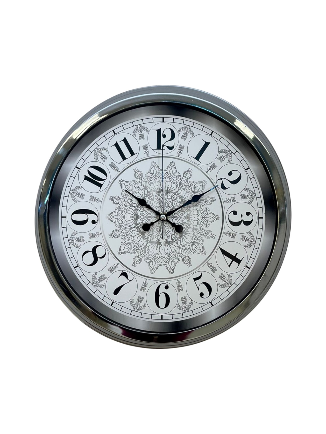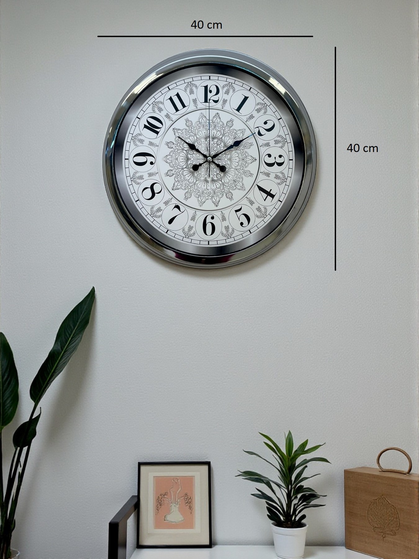 Estetik detayları ve modern görünümü bir arada sunan 40 cm Krom Metal Duvar Saati, hem dekoratif hem işlevsel bir ürün arayanlar için mükemmel bir tercihtir. Parlak krom çerçevesi, ışığı zarif bir şekilde yansıtarak bulunduğu alana modern bir şıklık katar. Saatin iç yüzeyinde yer alan özel işlemeli dekoratif desen, ürünü sıradan duvar saatlerinden ayıran sanat niteliğinde bir görünüm oluşturur.