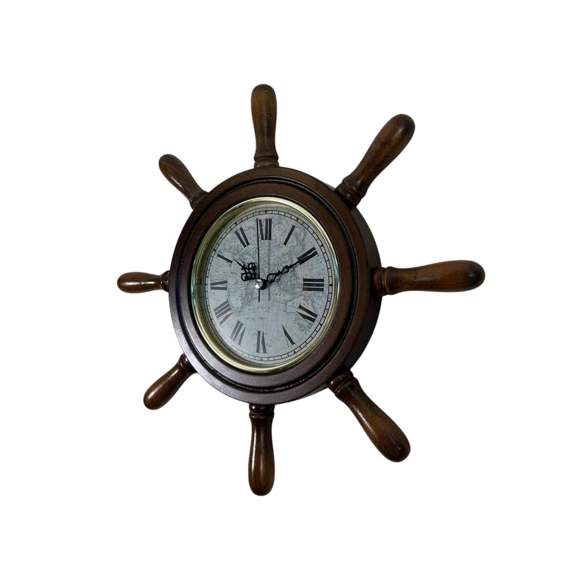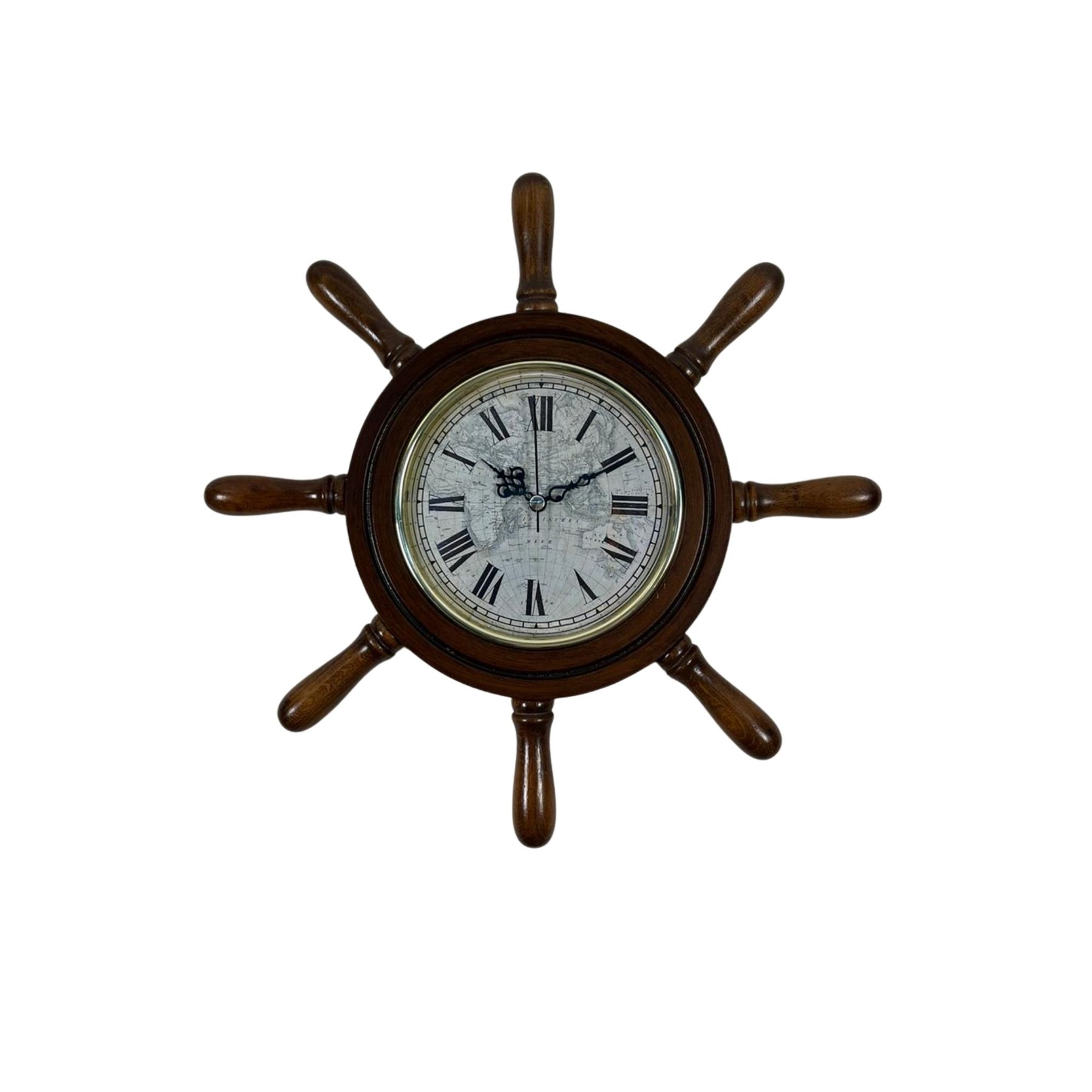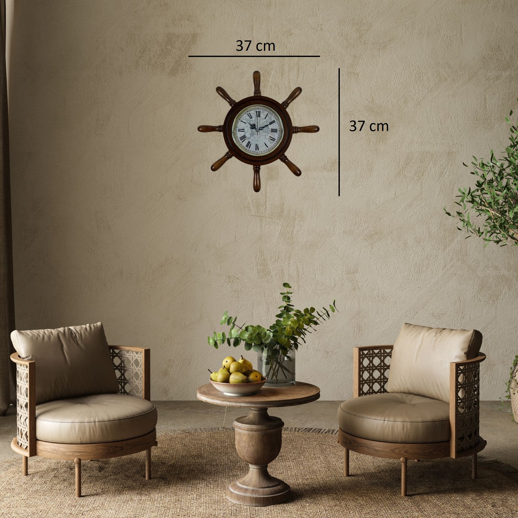 Saatin etrafında bulunan dümen kolları (kavelalar), gerçek bir gemi dümenini andıran detaylı bir tasarıma sahiptir. Bu kavelalar 8 cm uzunluğunda olup saatin marin karakterini güçlendiren estetik bir görünüm sunar. Saat kısmının çapı ise 37 cm olup duvar üzerinde dengeli ve dikkat çekici bir ölçü sunar.