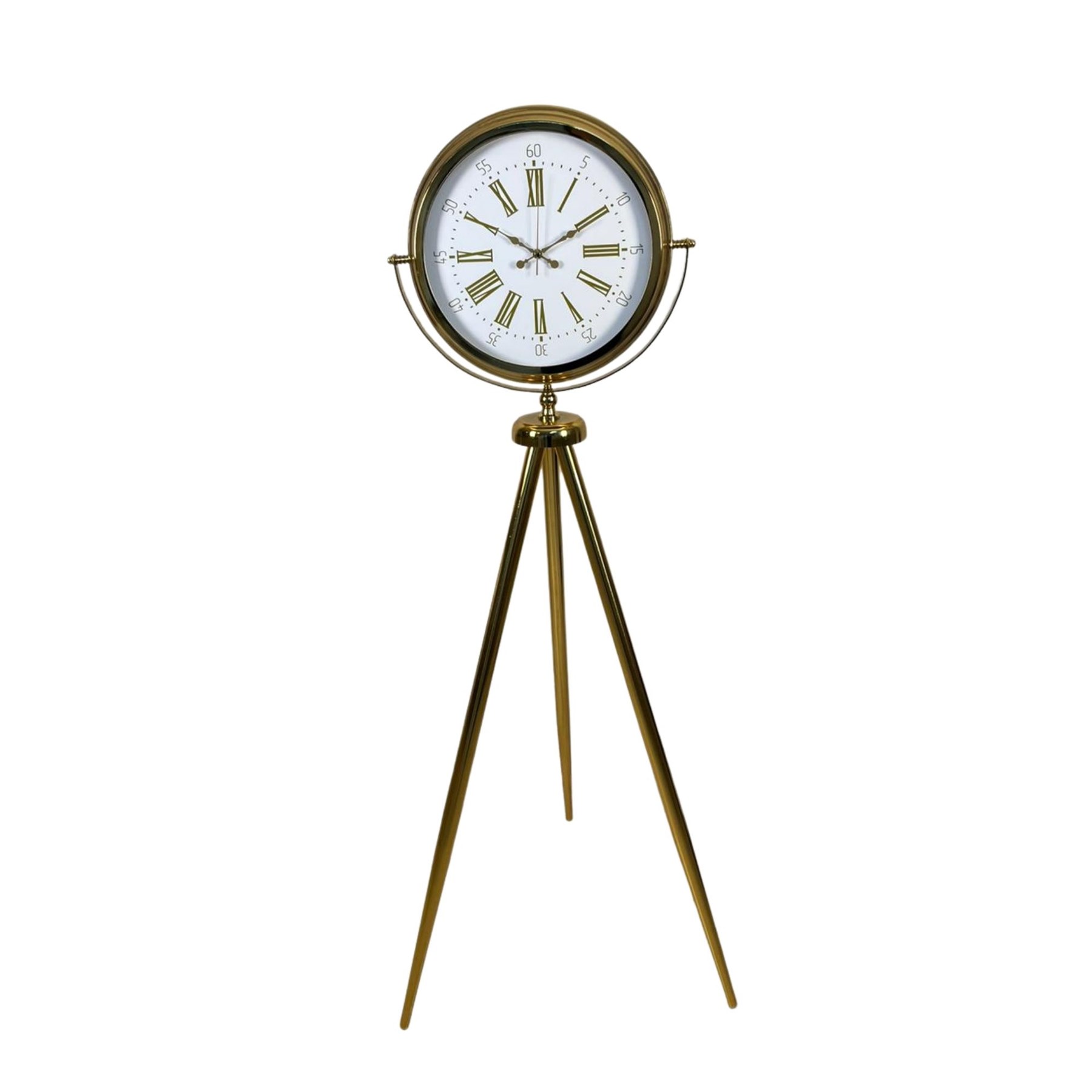 Modern ve klasik tasarımın zarif birleşimini sunan Gold Tripod Ayaklı Dekoratif Saat, bulunduğu ortama şıklık ve prestij kazandıran özel bir tasarıma sahiptir. İnce ve estetik metal tripod ayak yapısı sayesinde adeta dekoratif bir obje gibi durur ve salon, ofis, otel lobisi veya geniş yaşam alanlarında dikkat çekici bir görünüm oluşturur.