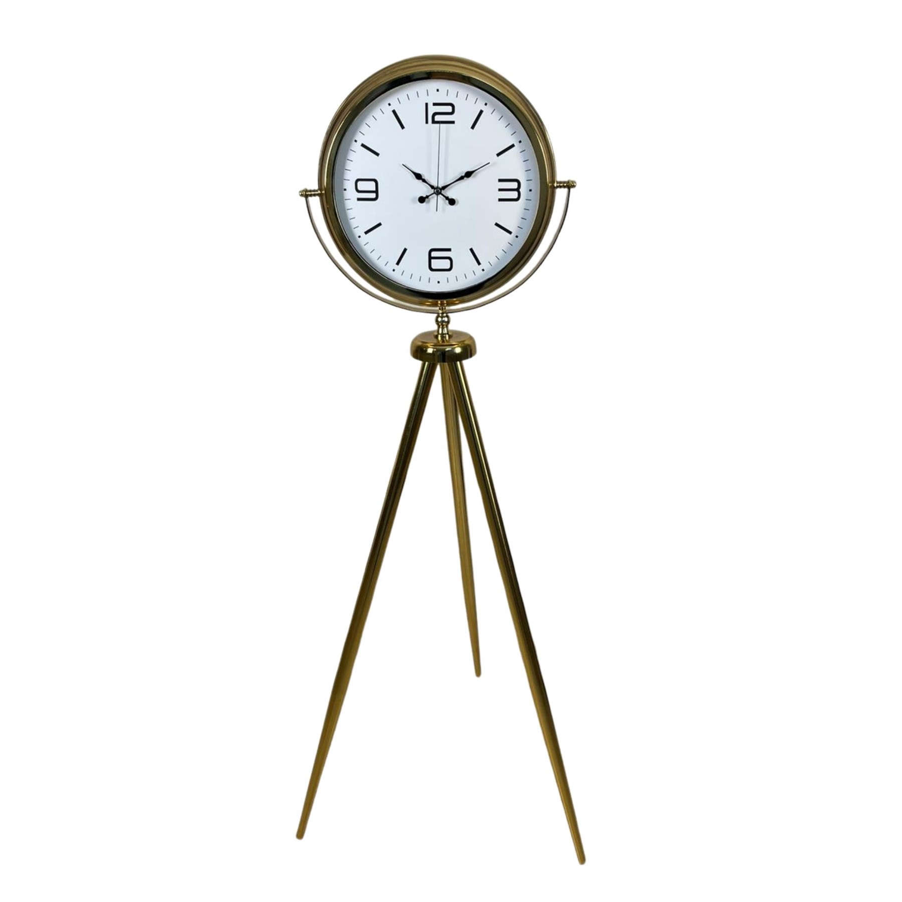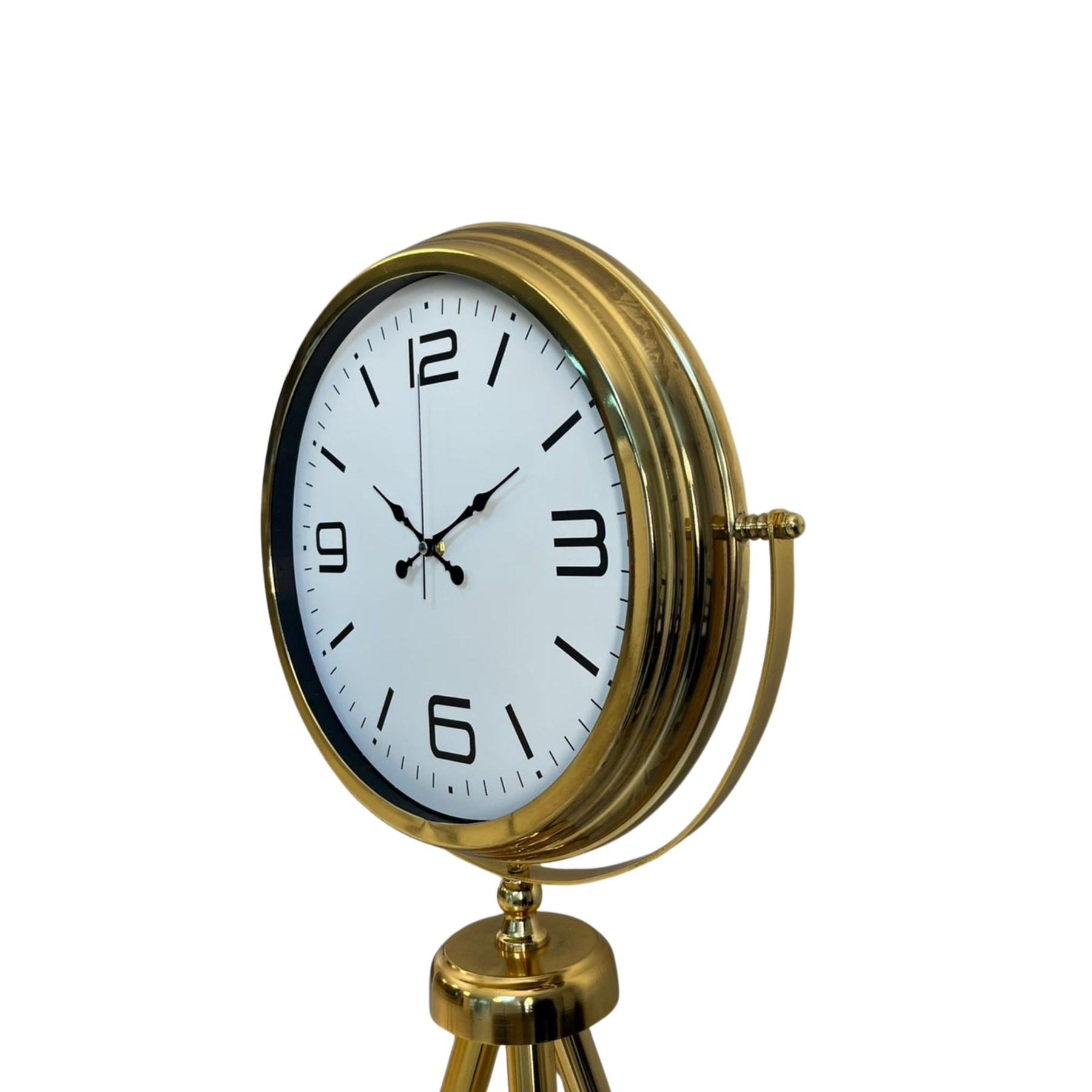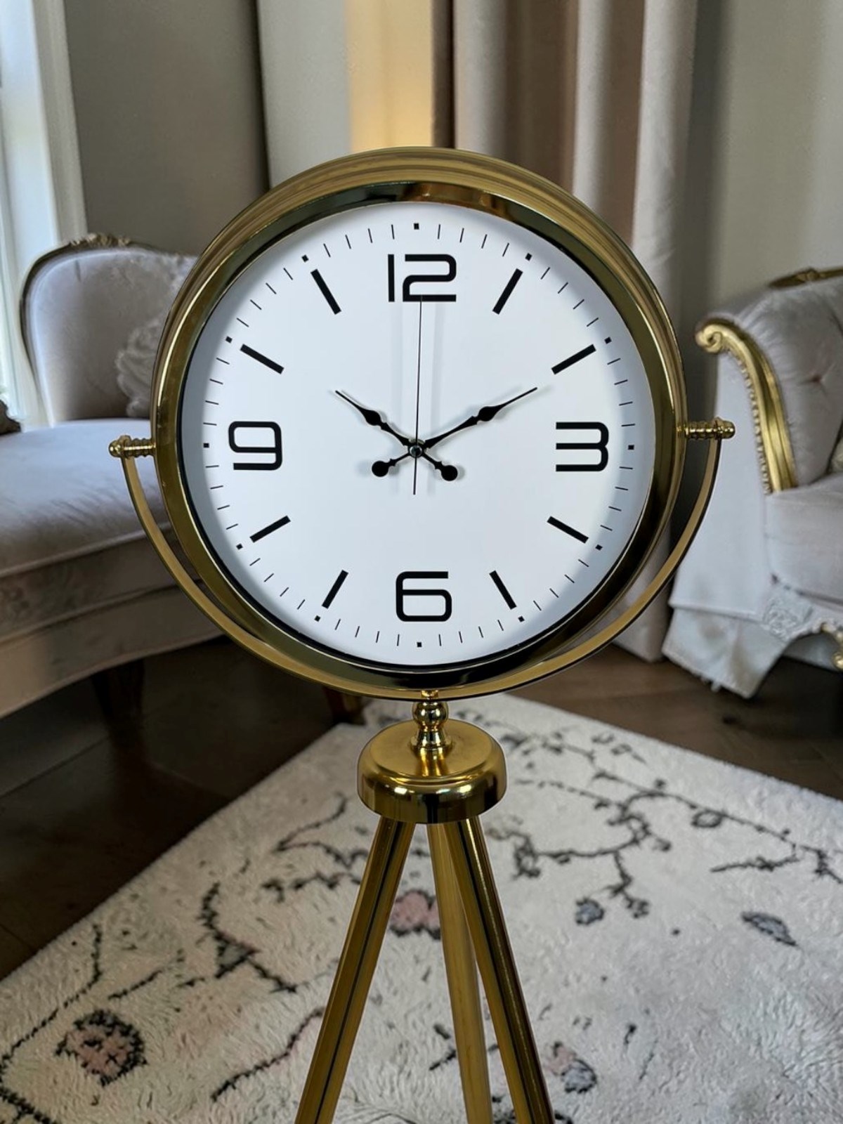 Modern tasarımı ve zarif detaylarıyla öne çıkan Gold Tripod Ayaklı Salon Saati, yaşam alanlarınıza estetik ve şık bir atmosfer kazandırır. İnce metal tripod ayak yapısı ve gold renkli gövdesi sayesinde salon, ofis, otel lobisi ve çalışma alanlarında dikkat çekici bir dekoratif obje olarak kullanılabilir.