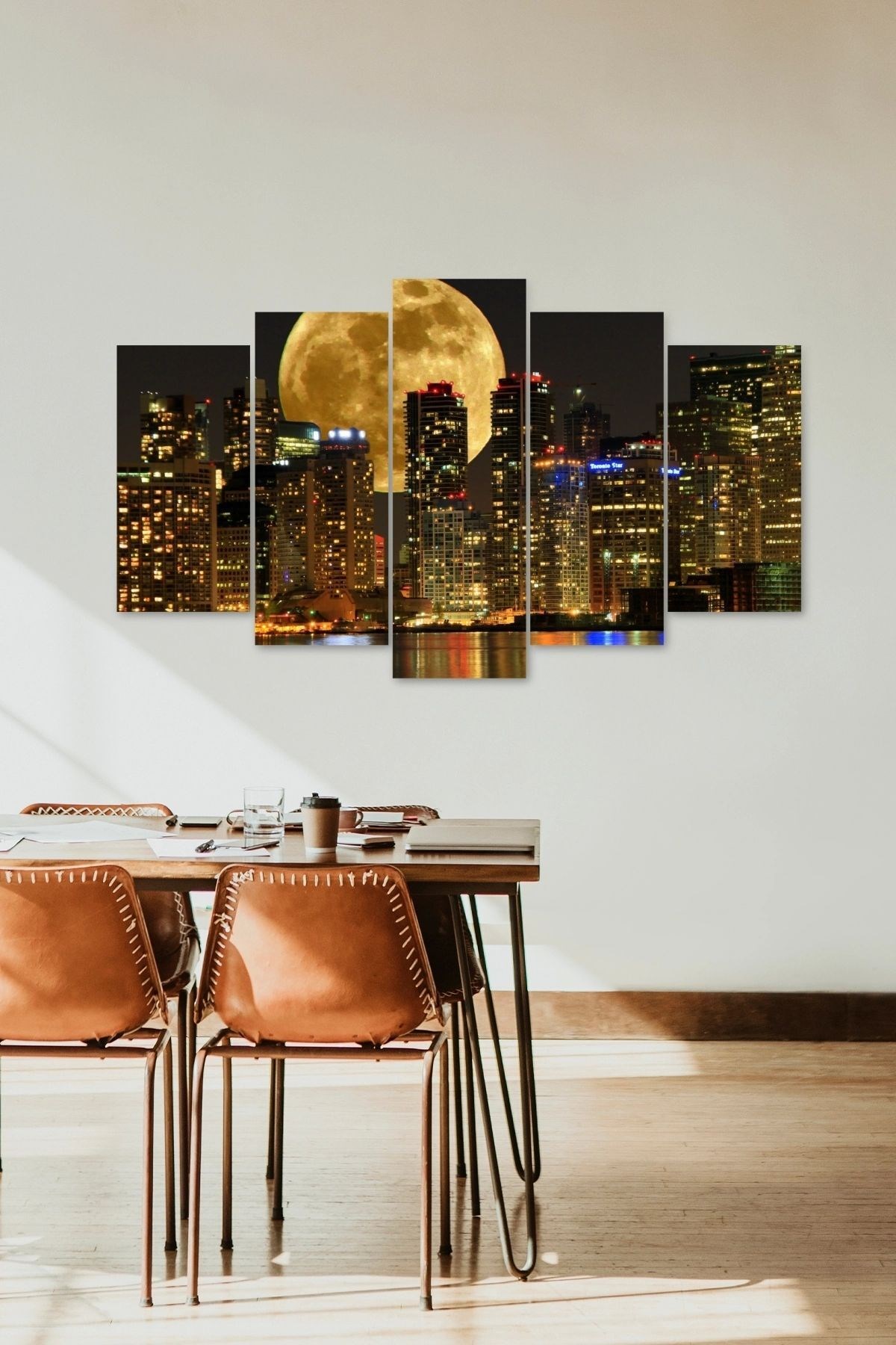 Modern tasarımıyla ev ve ofis dekorasyonunuza şıklık katan Ay ve şehir manzarası temalı 5 parçalı MDF tablo; Kaliteli MDF malzemesi sayesinde uzun ömürlü kullanım sunar ve dayanıklılığı ile öne çıkar; Ay ve şehir manzarası temalı bu tablo, hem görsel bir estetik sunar hem de mekanınıza modern bir dokunuş ekler;