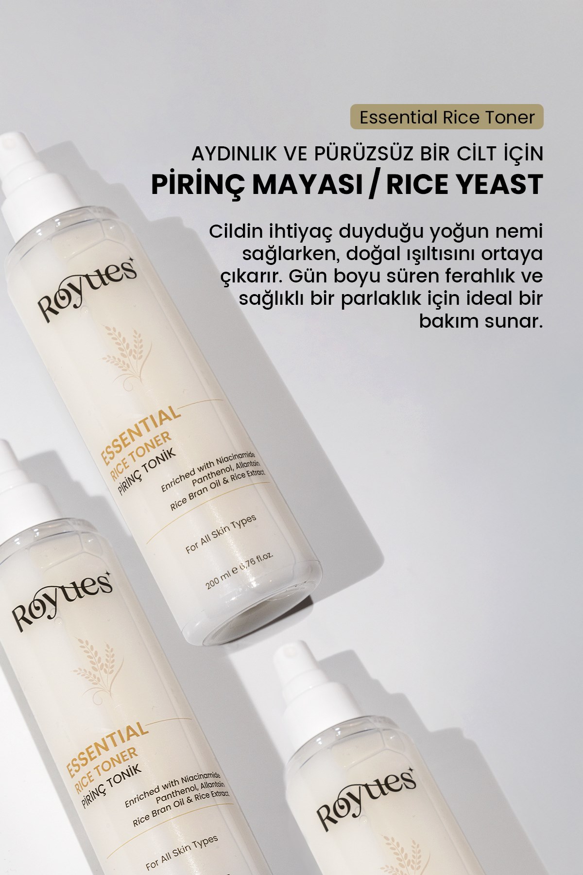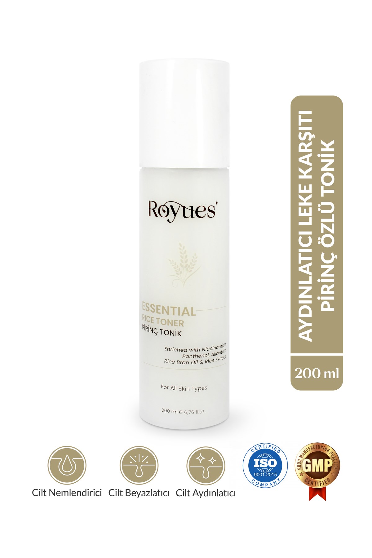 Royues - Aydınlatıcı ve Beyazlatıcı Pirinç Özlü Tonik, Rice Toner 200ml Niacinamide içeriği ile cildinizi aydınlatır ve daha parlak bir görünüm kazandırır. Panthenol sayesinde cildinizin nem dengesini korurken aynı zamanda beslenmesine yardımcı olur. Rice (Pirinç) özleriyle zenginleştirilmiş formülü, cildinize doğal bir beyazlık sağlar. 200 ml hacmiyle uzun süreli kullanım imkanı sunar; sık sık yeniden stoklama ihtiyacını azaltır. Tüm cilt tipleri için uygun olan bu tonik, herkes tarafından güvenle kullanılabilir. Vegan içerikli yapısıyla hayvan dostu bir güzellik rutinine katkıda bulunur. Şişe tipi ambalajı kolay uygulama ve hijyenik kullanım sağlar.