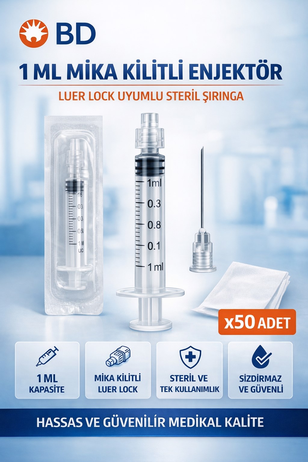 BD 1 ML Mika Kilitli Enjektör, hassas sıvı uygulamaları için özel olarak üretilmiş, güvenli ve profesyonel kullanıma uygun bir şırınga modelidir. Luer Lock (kilitli) uç sistemi sayesinde iğne bağlantısı sağlam şekilde sabitlenir ve kullanım sırasında sızdırma riskini azaltır.