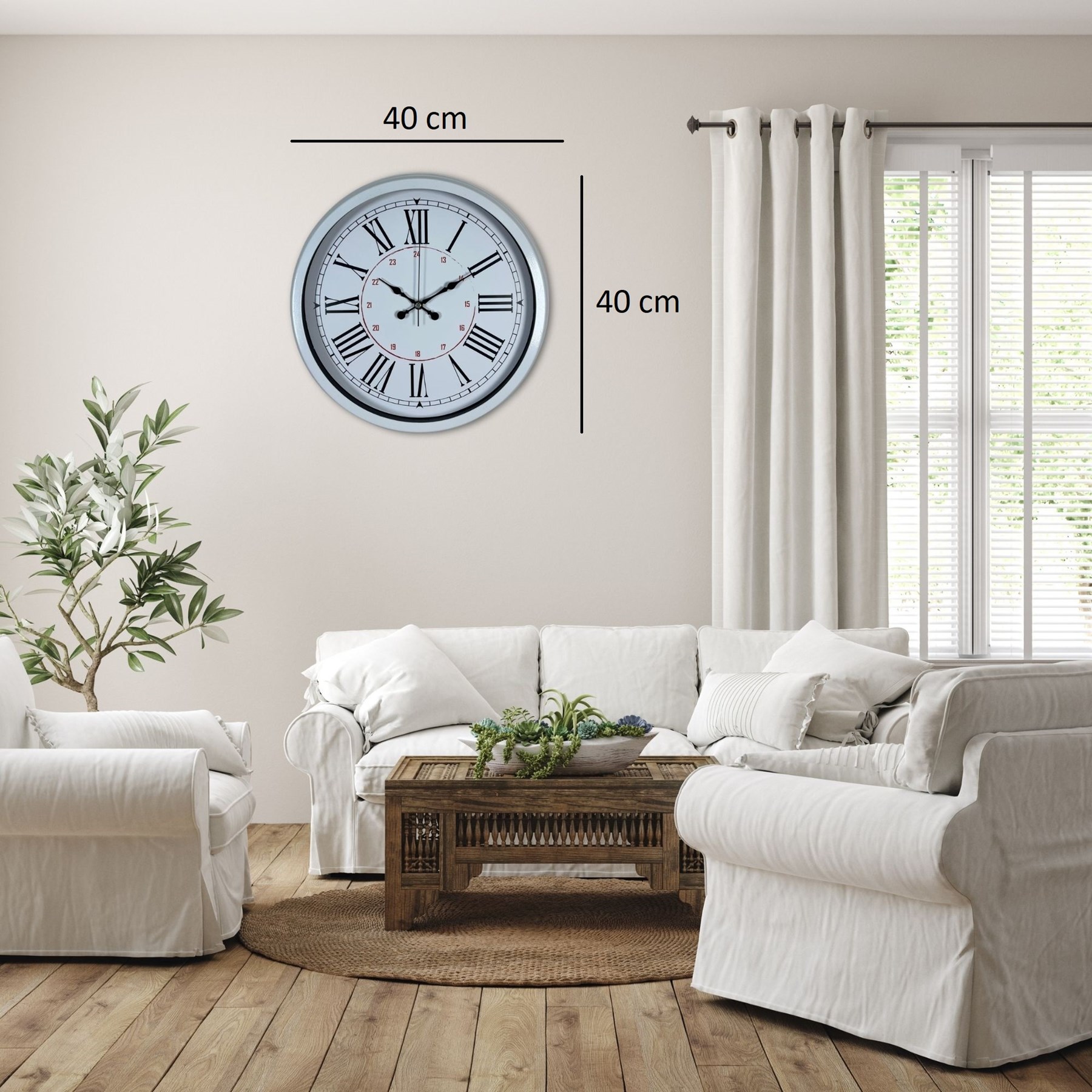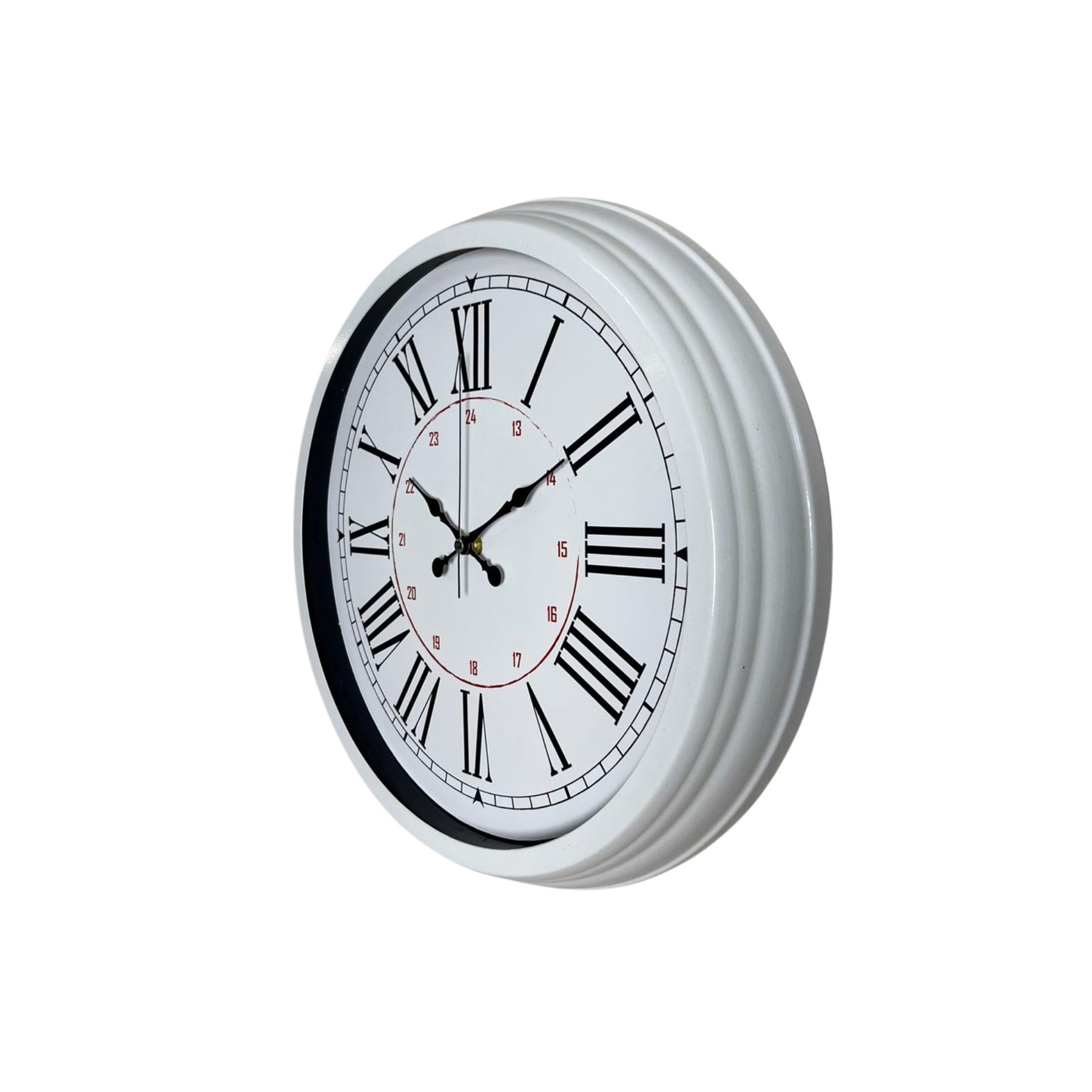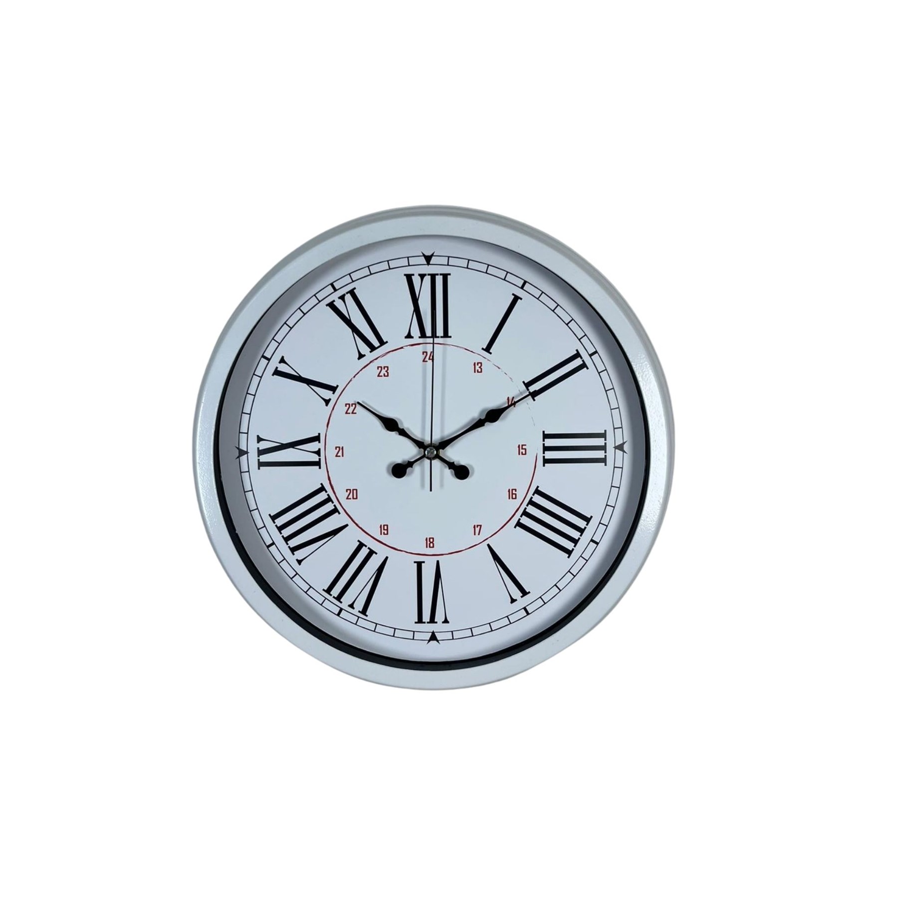 Zamansız tasarımı ve klasik Roma rakam detaylarıyla öne çıkan 40 cm beyaz metal duvar saati, hem dekoratif hem de işlevsel bir kullanım sunar. İç kadranında yer alan 24 saat göstergesi sayesinde diğer standart saatlerden farklı olarak günün tüm saatlerini detaylı şekilde takip etmenizi sağlar.