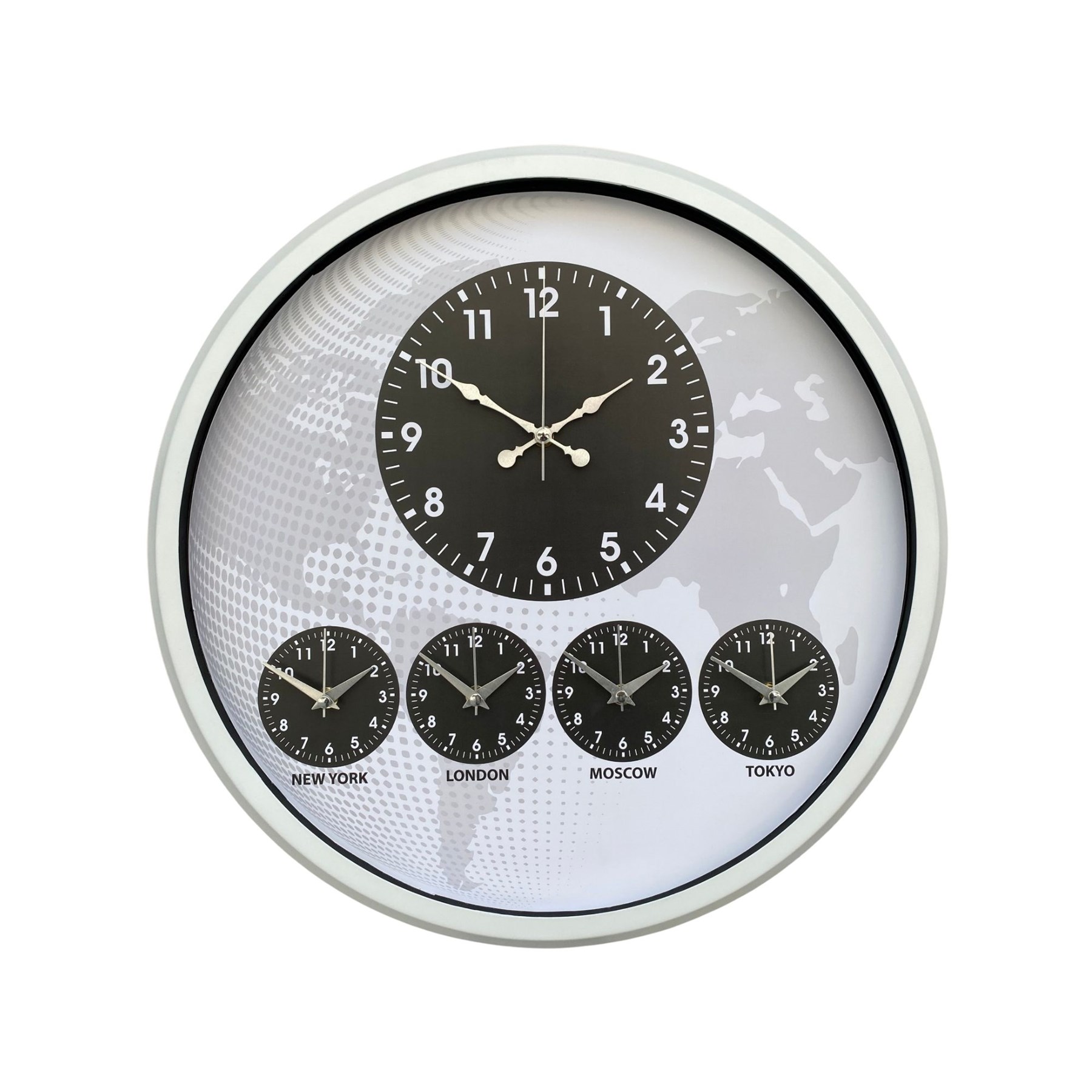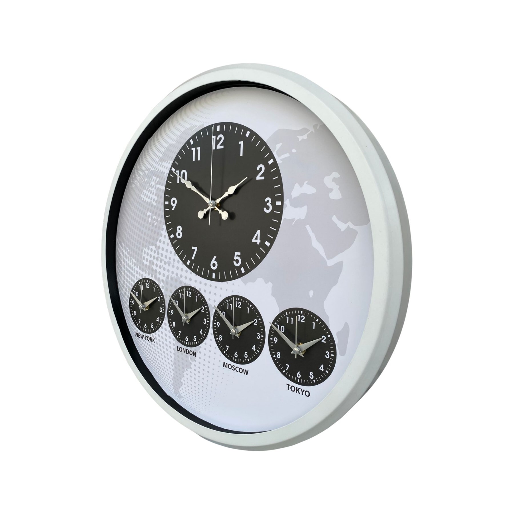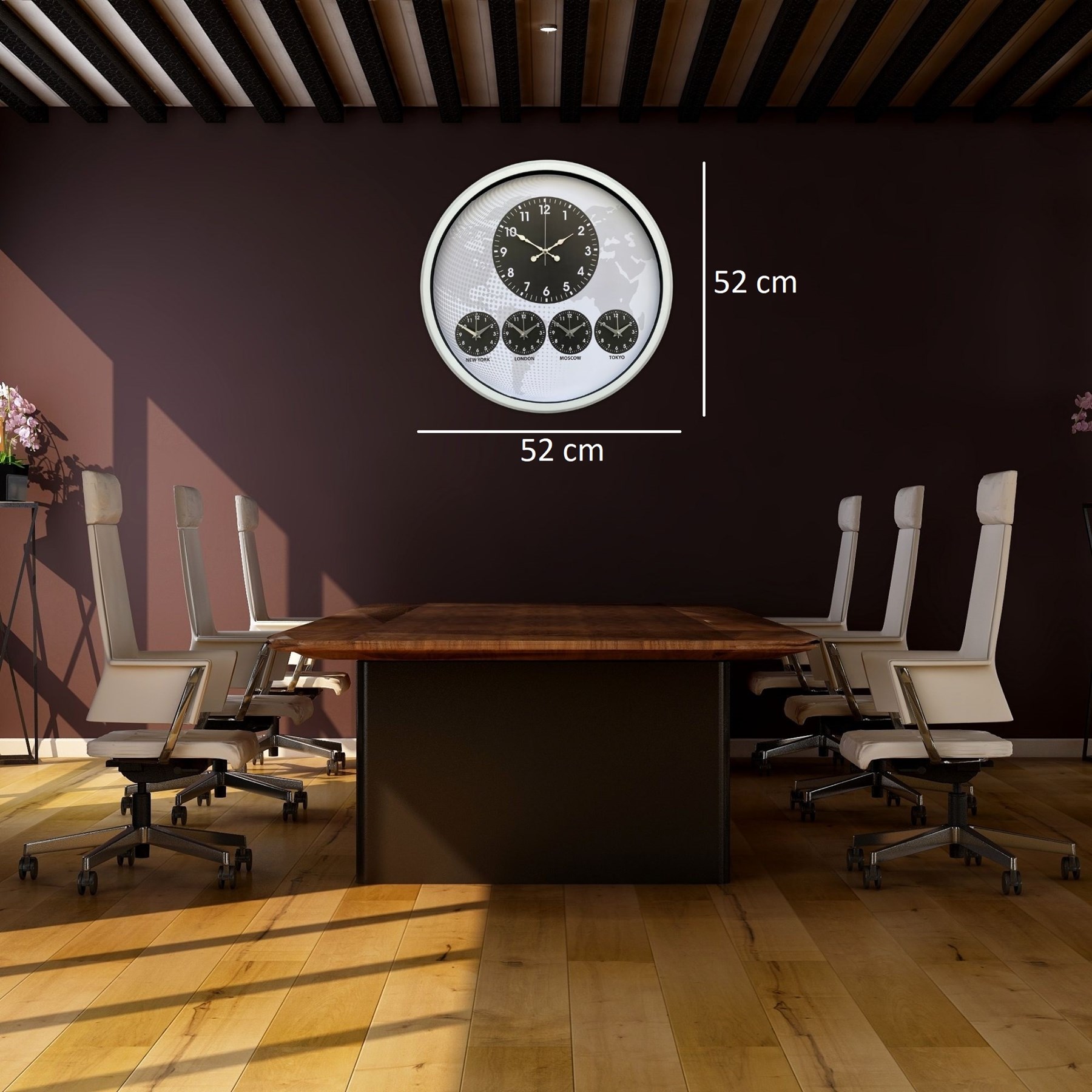 Merkezde bulunan büyük ana saat net ve kolay okunabilir yapı sunarken, alt bölümde yer alan New York – London – Moscow – Tokyo zaman göstergeleri uluslararası bağlantıları olan işletmeler için fonksiyonel bir kullanım sağlar.