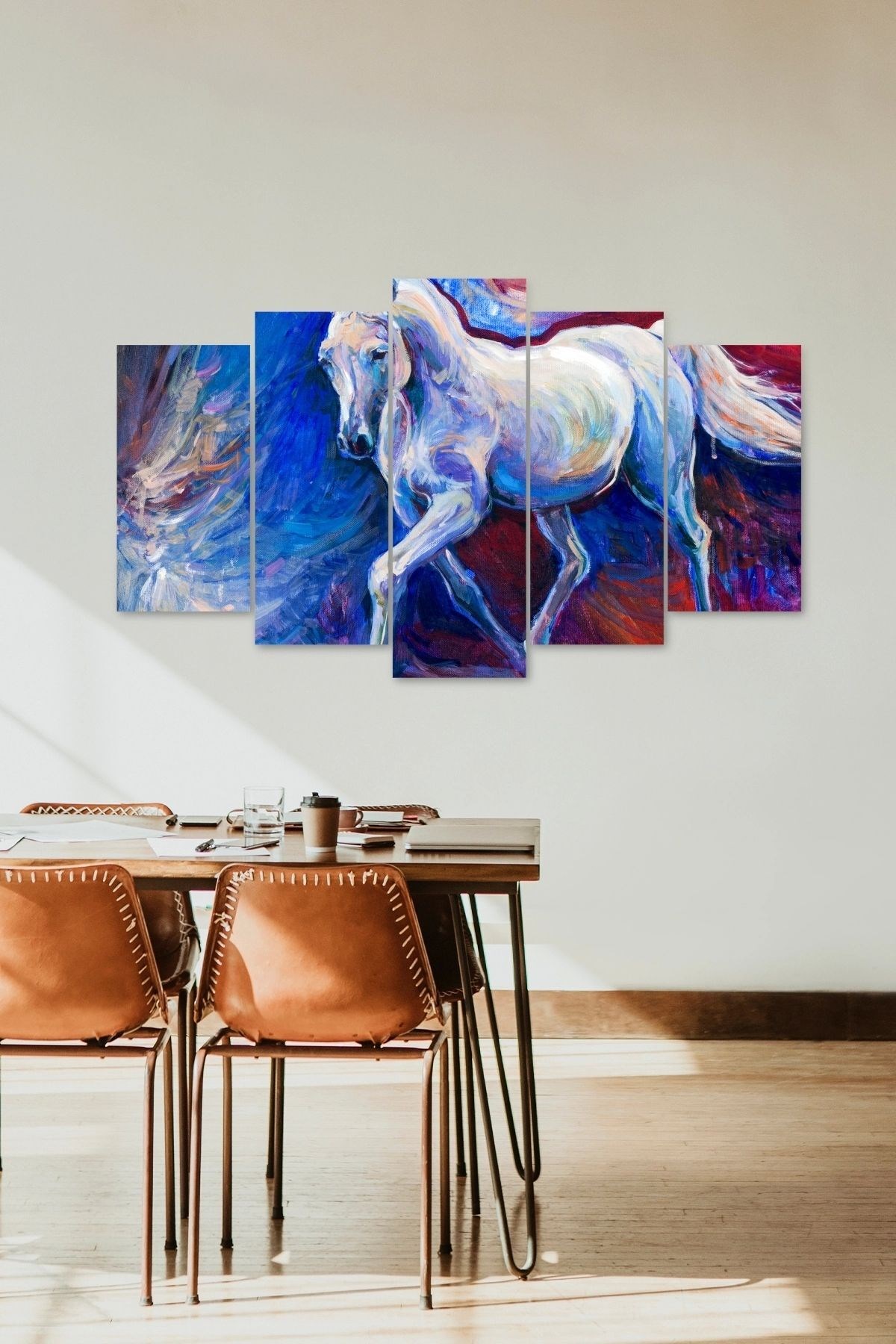 Modern dekorasyonun vazgeçilmez bir parçası olan bu beyaz at manzara tablosu, evinizin veya ofisinizin atmosferini canlandırır; Yüksek kaliteli MDF malzemeden üretilmiş olup, uzun ömürlü kullanım sunar; Modern tasarımıyla dikkat çeken bu 5 parçalı set, mekanınıza şıklık katar ve estetik bir görünüm sağlar;