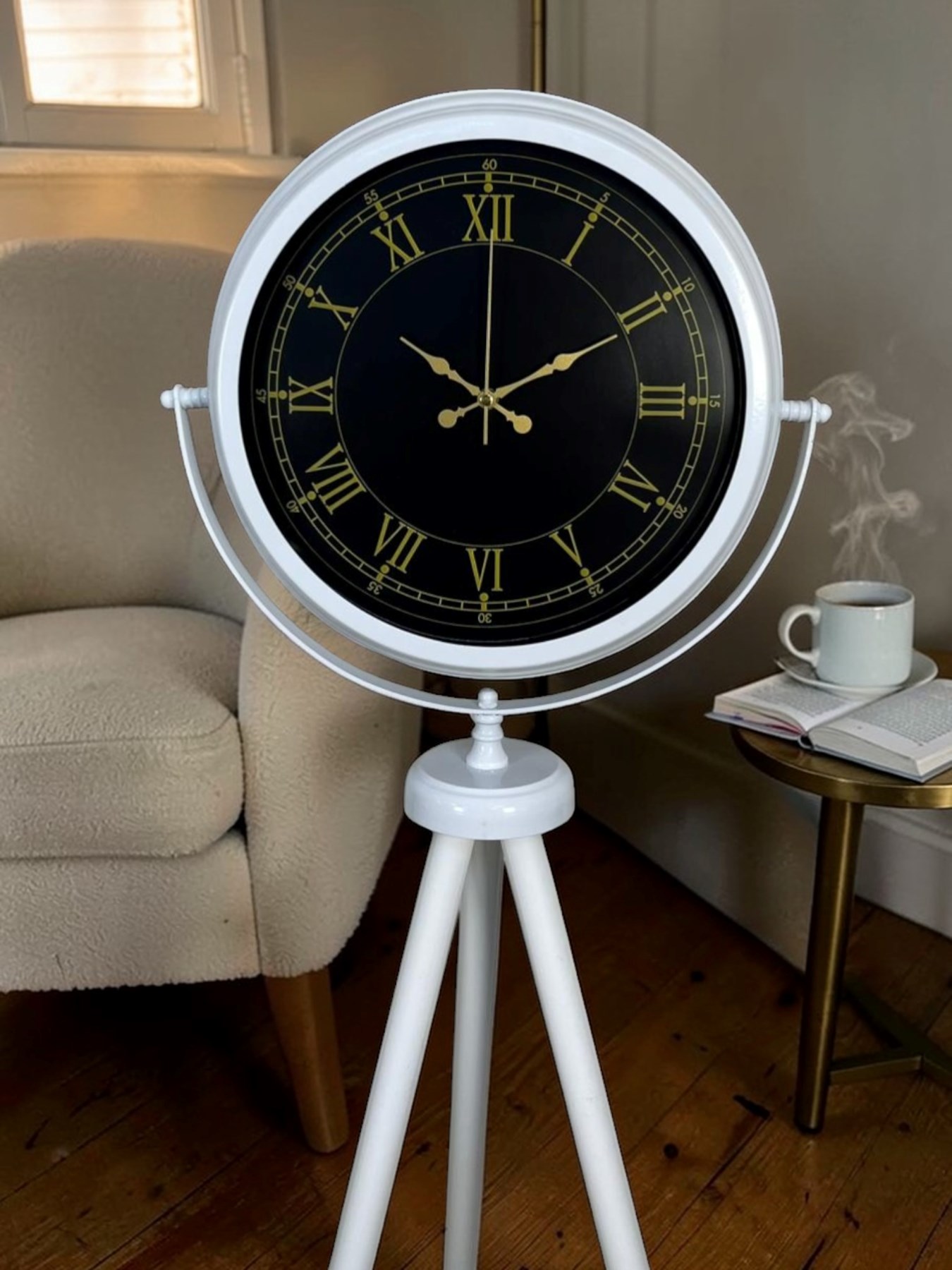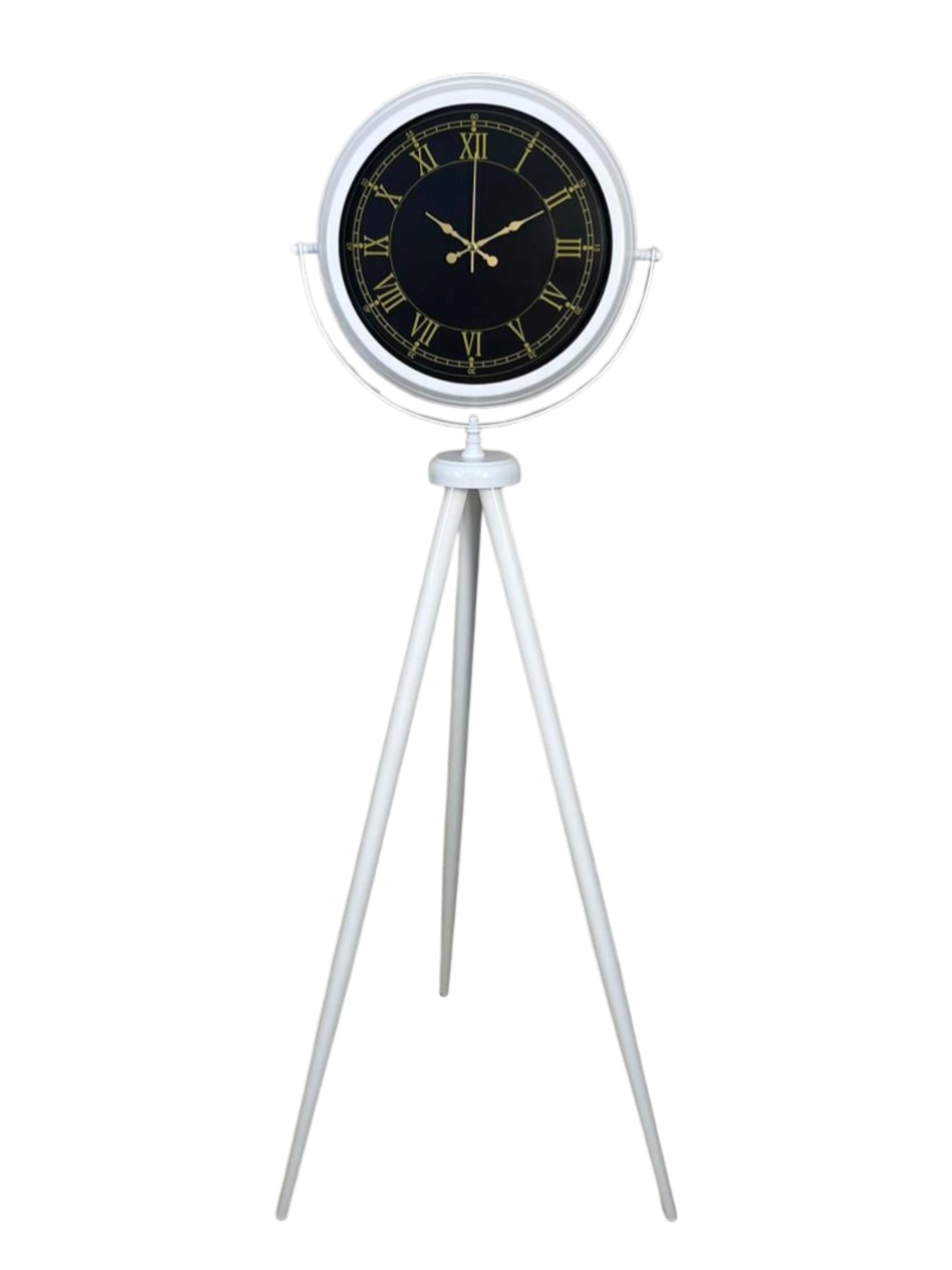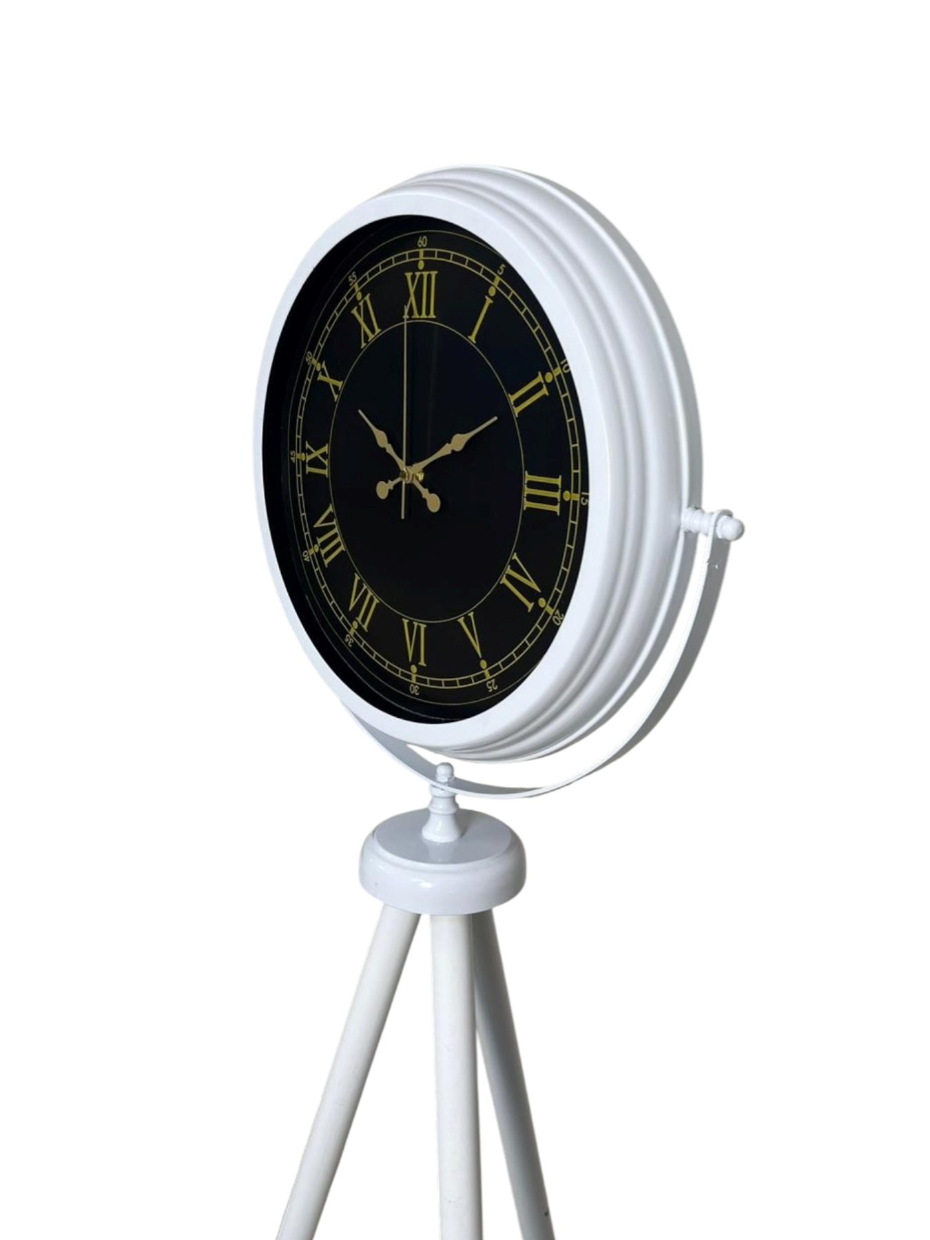 Lüks ve zamansız tasarımıyla dikkat çeken 150 x 45 cm beyaz ayaklı saat, siyah kadranı ve gold Roma rakam detaylarıyla bulunduğu ortama güçlü bir karakter kazandırır. Klasik Roma stilinin modern tripod tasarımla birleşmesi, ürünü hem şık hem de dikkat çekici bir dekorasyon parçası haline getirir.